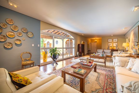Casa Térrea de Alto Padrão em Amplo Terreno na Granja Viana Implantada em um terreno excepcional de 1.848 m², com 653 m² de área construída, esta casa térrea impressiona pelo espaço, pela integração com a natureza e pelo projeto que privilegia conforto, privacidade e lazer. Logo na entrada, um hall amplo com espaço para escritório dá as boas-vindas e conduz aos ambientes sociais. O living para dois ambientes oferece aconchego e versatilidade, enquanto a sala de jantar integrada à cozinha cria um espaço funcional e convidativo para o dia a dia e para receber. A residência conta ainda com uma sala de TV reservada, ideal para momentos de descanso e entretenimento. Um dos grandes destaques do imóvel é a área gourmet envidraçada, distribuída em quatro ambientes, perfeita para confraternizações em qualquer época do ano, com total integração ao lazer externo. Na área externa, a casa oferece uma piscina com varanda e pergolado, cercada por um jardim exuberante, cuidadosamente paisagístico, que inclui um lago com carpas e um encantador orquidário, proporcionando uma atmosfera de tranquilidade e contato direto com a natureza. O imóvel dispõe ainda de uma casa de hóspedes independente, com 3 dormitórios, cozinha integrada a dois ambientes de sala e banheiro, garantindo conforto e privacidade para visitantes ou familiares. A área de serviço é ampla, com acesso a um quintal generoso, oferecendo praticidade e excelente espaço de apoio. O proprietário estuda permuta como parte de pagamento, por casa de menor valor na Granja Viana. Uma propriedade única para quem busca espaço, lazer completo e natureza em perfeita harmonia. Agende sua visita e venha conhecer este verdadeiro refúgio.
