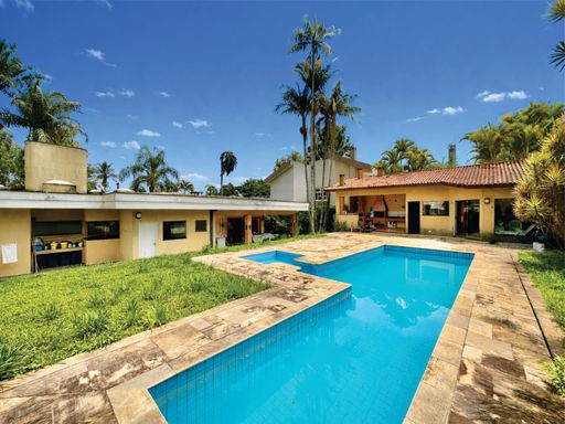 Ótima casa ampla, funcional e muito confortável, construída para moradia própria, com boa acessibilidade por rampa lateral pelo jardim. Localizada em condomínio com controle de acesso, segurança 24 horas e excelente estrutura de lazer. O imóvel é repleto de armários e possui portas e janelas em alumínio com pintura eletrostática, vidro, telas e grades. Conta com projeto de gesso e iluminação e cinco claraboias que garantem ótima iluminação natural. Os pisos combinam tábuas largas, mármore Crema Marfil, porcelanato, madeira, cerâmica e pedras Miracema e Goiás. Louças e metais são de qualidade. A casa possui três acessos: social/garagem, lazer e serviço. A entrada social é feita por porta dupla em madeira trabalhada com vidro. Logo na entrada há um amplo salão multiuso de aproximadamente 90 m² com lavabo e depósito, ideal para escritório, academia, estúdio, brinquedoteca ou sala de jogos. A escada social é de alvenaria revestida em madeira, com adega e espaço de armazenamento sob a escada. O hall central distribui as áreas social, íntima, de serviço e lazer. A casa é ensolarada, bem arejada e iluminada. Na área íntima são cinco suítes: três no corpo principal, sendo a master com closet senhor e senhora; uma suíte térrea com acessibilidade e entrada independente pela garagem; e uma suíte externa próxima ao espaço gourmet. Os banheiros possuem tampos em granito, gabinetes, espelhos e box de vidro. O lavabo conta com lavatório externo em mármore Crema Marfil. O living integra vários ambientes com duas varandas, incluindo salas de estar, lareira, bar, música, jantar com porta-balcão e um family room ou home theater mais reservado. A copa-cozinha planejada é ampla e iluminada, integrada à sala de jantar, com bancada em “U”, cuba inox, despensa e muitos armários. A área de serviço possui lavanderia fechada integrada à cozinha e espaço externo ensolarado com dois tanques inox. A área de lazer conta com amplo quintal e jardim com paisagismo formado, incluindo palmeiras e árvores frutíferas como goiaba, jabuticaba, limão-cravo e maracujá. O salão gourmet é completo e integrado à piscina, com churrasqueira, forno e fogão a lenha, forno de pizza, bancada em “L”, cuba inox e espaço para geladeira. Há ainda uma suíte multiuso envidraçada integrada ao espaço gourmet e à piscina, ideal para hóspedes, escritório ou sala de TV. O vestiário atende à área de lazer com lavatório externo e box de vidro. A piscina de alvenaria mede 12,5 m x 4 m, com raia, piscina infantil, solário e casa de máquinas. O imóvel possui depósitos, boiler, porteiro eletrônico e garagem para 10 vagas, sendo 5 cobertas. Localizada no Condomínio Nova Higienópolis, com acesso pela Estrada Fernando Nobre, próximo ao km 29 da Rodovia Raposo Tavares e fácil acesso ao Rodoanel e Alphaville. O residencial oferece segurança 24 horas, portaria, ronda interna e infraestrutura de lazer com quadras, campo society, pista de skate, parques infantis e lago, em um ambiente tradicional e tranquilo.