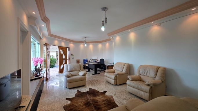 Localizada no exclusivo Condomínio Chácara das Paineiras II, esta incrível residência térrea combina amplitude, conforto e integração com a natureza em um terreno de 2.884m². Com uma área construída de 619,32m², a casa é ideal para quem valoriza ambientes generosos e bem distribuídos, além de um estilo de vida tranquilo e sofisticado. O imóvel conta com seis quartos, sendo três suítes – uma delas a suíte principal, que oferece closet espaçoso e privacidade. Além disso, há uma suíte para empregado e um banheiro social, complementados por um roupeiro iluminado naturalmente no corredor. O living é um espetáculo à parte, com quatro ambientes integrados: TV, estar, jantar e sala com lareira ecológica, todos voltados para uma ampla varanda com vista encantadora para o quintal e áreas verdes. A cozinha é totalmente planejada e acompanha despensa e copa, oferecendo praticidade no dia a dia. Um dos destaques é a sala de cinema, perfeita para o entretenimento em casa. A área de serviço é ampla, com depósito e acesso a um quintal reservado, garantindo discrição e funcionalidade. Para os momentos de lazer, a casa oferece piscina ensolarada durante todo o dia, varanda externa com espaço para jogos, e um bangalô com vista deslumbrante. A área gourmet completa possui churrasqueira, cozinha planejada e linda vista para o jardim, além de dois banheiros de apoio – masculino e feminino – para maior comodidade dos convidados. O paisagismo é um verdadeiro refúgio verde, com gramado impecável e espaço nos fundos ideal para horta, pomar ou a instalação de uma quadra de tênis ou campo de futebol. Há ainda um canil, uma casa externa com três cômodos e banheiro que pode ser usada como escritório ou moradia para funcionários, e garagem coberta para até cinco veículos. Essa propriedade única reúne elegância, funcionalidade e integração com a natureza, oferecendo um estilo de vida exclusivo e confortável em um dos condomínios mais desejados da região.