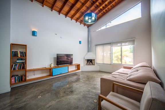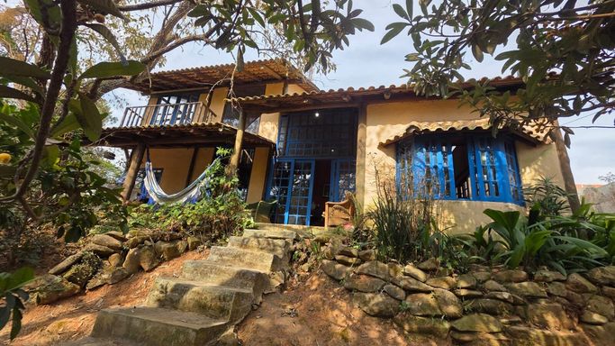 Casa rústica à venda em condomínio fechado, um verdadeiro refúgio cercado pelo verde, ideal para quem busca qualidade de vida, privacidade e conexão com a natureza sem abrir mão de conforto e segurança. Implantada em terreno amplo de 1.500 m², a propriedade se destaca pela arquitetura única e cheia de personalidade, construída em eucalipto autoclavado, com pé-direito duplo, telhado aparente e grandes panos de vidro que integram os ambientes internos à paisagem natural ao redor. O piso em cimento queimado reforça o estilo rústico contemporâneo, enquanto portas e janelas de madeira de demolição e o assoalho ripado da sala de lareira trazem aconchego e sofisticação na medida certa. Logo na entrada, o hall conduz a um amplo living com sala de estar e jantar integradas, pé-direito de aproximadamente seis metros, ventilação cruzada e excelente iluminação natural. A sala de lareira possui uma charmosa bay window com moldura em dormentes, perfeita para contemplar o jardim e o pôr do sol. O lavabo complementa o espaço social com elegância. A cozinha é clara, arejada, com várias janelas e acesso direto ao quintal, conectando praticidade e funcionalidade ao dia a dia. A área de serviço é coberta e bem posicionada nos fundos do imóvel. A área íntima conta com três suítes amplas e confortáveis. A suíte principal é um verdadeiro refúgio, bem iluminada e arejada, com varanda privativa e banheiro equipado com banheira, garantindo total privacidade através de um acesso diferenciado por escada em dormentes. As outras duas suítes também são espaçosas, com grandes janelas voltadas para o sol da tarde, sendo uma delas com banheira. Um mezanino acolhe uma sala íntima ou family room com varanda, enquanto o segundo mezanino, maior, é extremamente versátil, podendo ser utilizado como sala de TV, escritório, home office ou até mesmo um amplo quarto de hóspedes com varanda. Na área externa, o jardim e o quintal formam um verdadeiro bosque particular, com árvores frutíferas, espécies nativas e ornamentais, criando um ambiente de paz e bem-estar. A piscina com prainha, deck molhado, hidromassagem e área de descanso completa o espaço de lazer, ideal para momentos de relaxamento e convivência. O imóvel ainda conta com ateliê em um platô superior do terreno, atualmente equipado como estúdio de cerâmica com forno a gás de alta temperatura, cozinha e banheiro de apoio, mas com potencial para se transformar em salão de festas, estúdio criativo, academia ou espaço multiuso. O acesso independente pela rua lateral amplia ainda mais as possibilidades de uso. Localizada em condomínio fechado com área verde preservada, o residencial oferece segurança, portaria com controle de acesso, câmeras, interfone e ruas asfaltadas, além de permitir animais e proporcionar um ambiente tranquilo e familiar. Uma casa única, para quem valoriza natureza, espaço, conforto e um estilo de vida mais leve, onde o som dos pássaros, a presença de animais silvestres e o pôr do sol fazem parte da rotina.