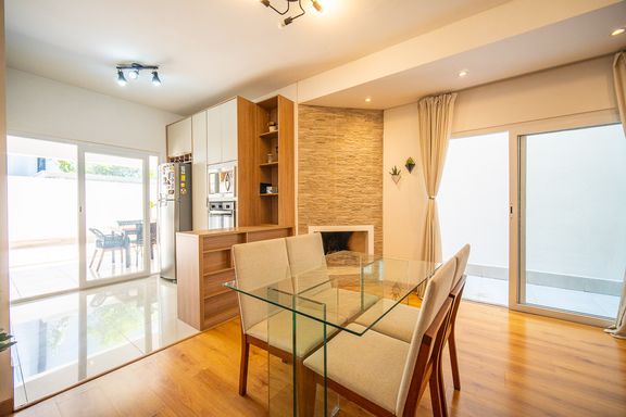 Este lindo sobrado em condomínio fechado na Granja Viana é ideal para quem busca conforto, praticidade e uma localização privilegiada. O living amplo acomoda dois ambientes integrados, sala de estar e sala de lareira, criando um espaço acolhedor para receber e relaxar. A sala de jantar se conecta ao quintal com área de churrasqueira, perfeita para momentos de lazer em família. A cozinha, moderna e funcional, é repleta de armários planejados e conta com área de serviço ao lado, garantindo praticidade no dia a dia. No piso superior, a área íntima dispõe de três dormitórios, sendo uma suíte, além de corredor com roupeiro. Os acabamentos foram cuidadosamente escolhidos, com porcelanato na área social e laminado nos quartos, combinando sofisticação e conforto. O imóvel ainda oferece duas vagas de garagem descobertas. O condomínio traz a tranquilidade de um projeto diferenciado, cercado de verde e muito bem localizado. A estrutura de lazer inclui piscina adulto e infantil, salão de festas, quadra esportiva, churrasqueira, playground e portaria 24 horas com monitoramento. Além disso, conta com portaria virtual e zelador em horário comercial. A localização é estratégica: próxima a importantes escolas como Rio Branco, Maple Bear, Anglo e St. John’s, além de supermercados renomados como Pão de Açúcar, St Marche, Sam’s Club e Big. A poucos minutos do Shopping da Granja Viana, The Square e da padaria Dona Deôla, também oferece fácil acesso à Rodovia Raposo Tavares e ao Rodoanel. Com 233m² de área total e 125m² de área privativa, este sobrado com 3 dormitórios, sendo 1 suíte, é uma excelente oportunidade para viver com qualidade de vida em um dos endereços mais desejados da região.