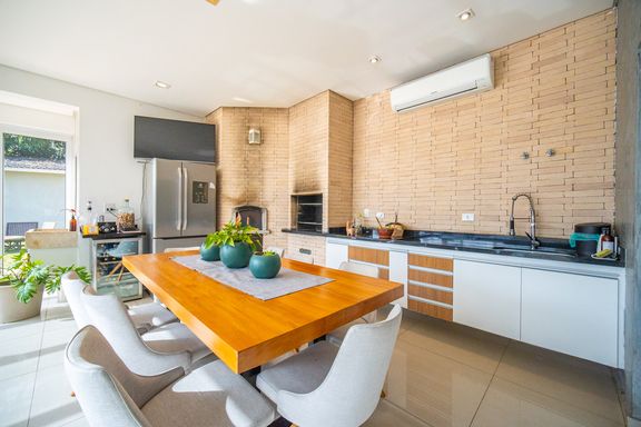 Localizada no prestigiado condomínio Alphaville Granja Viana, esta casa moderna encanta pelo projeto arquitetônico integrado, funcional e cheio de personalidade. Com três acessos independentes — social, lazer e serviço —, o imóvel foi cuidadosamente planejado para oferecer conforto, sofisticação e praticidade no dia a dia. O hall de entrada com porta pivotante de madeira dá as boas-vindas ao amplo living para quatro ambientes, composto por salas de estar, jantar, TV e bar. Todos esses espaços são voltados para a área de lazer, criando um ambiente fluido e iluminado. A casa é ensolarada, bem ventilada e totalmente preparada para ar-condicionado, com portas e janelas externas em alumínio marrom e vidro, além de persianas automatizadas nos quartos. As portas internas contam com borrachas de vedação, reforçando o isolamento acústico. A área gourmet, anexa à piscina, é um convite ao convívio. Conta com churrasqueira Politec, coifa, bancada, pia e lavabo, ideal para receber amigos e familiares. A piscina de alvenaria é revestida em cerâmica, com iluminação, prainha, hidro e está preparada para aquecimento, complementada por um amplo solarium. O depósito e a casa de máquinas reforçam a organização e funcionalidade dos espaços externos. No piso superior, o hall íntimo dá acesso a quatro confortáveis suítes, todas com persianas elétricas e preparação para ar-condicionado. A suíte master se destaca pelo amplo closet e banheiro completo, com duas cubas, dois nichos, duas duchas e gabinete. Todos os banheiros possuem box de vidro e espelhos. Os pisos são em porcelanato nas áreas sociais, porcelanato rústico antiderrapante na área externa e tacos de madeira na área íntima, destacando o alto padrão de acabamento do imóvel. A cozinha planejada é prática e elegante, com armários sob medida, bancada em “L” de granito com duas cubas inox e uma funcional despensa. A lavanderia é composta por área de serviço ensolarada, parte coberta e fechada com tanque, além de uma dependência de empregada com quarto e banheiro e acesso independente. A garagem acomoda até quatro veículos, sendo duas vagas cobertas. O condomínio Alphaville Granja Viana é referência em alto padrão, com segurança armada 24 horas, portaria com controle de acesso, sistema de monitoramento e grandes áreas de preservação permanente cercadas e monitoradas. A infraestrutura de lazer inclui clube com sede social, academia, salão de festas com varanda, kids room, salão de jogos, bar, restaurante, piscina com deck e solarium, quiosque com churrasqueira, quadras esportivas, campo de futebol e playground. Tudo isso em uma localização privilegiada na Avenida São Camilo, com fácil acesso às principais vias da Granja Viana.