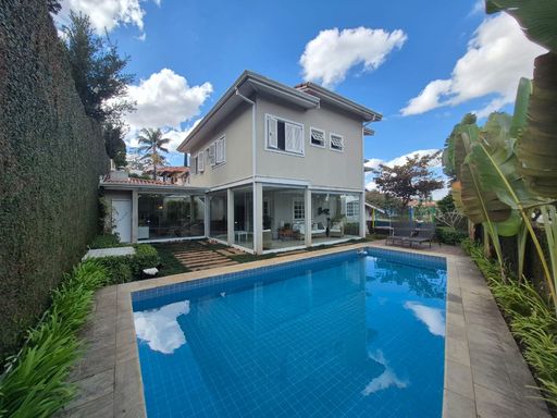 Esta impressionante casa possui um acabamento de alto padrão, o imóvel é impecável e repleto de detalhes que garantem elegância. Seus pisos incluem pedra mineira, revestimento de madeira, carpete, Miracema e cerâmica, enquanto as portas e janelas em madeira e vidro permitem grande entrada de luz natural. As telhas de concreto complementam a estrutura, oferecendo resistência e durabilidade. O jardim é cuidadosamente planejado, com paisagismo e diversas frutíferas, como amora, limão, jabuticaba, açaí, pitanga, romã, abacate manteiga, avocado, cúrcuma e café, proporcionando aos moradores uma alimentação saudável diretamente do quintal. Além disso, o imóvel conta com 4 acessos distintos — social, lazer, garagem e serviço — facilitando a circulação e proporcionando conveniência. Ao entrar, é possível apreciar o hall social, que dá acesso à escada revestida em madeira com guarda-corpo de madeira. A casa conta com um family room, 5 suítes com armários planejados, sendo a master equipada com bay window, closets sr. e sra., terraço e vista panorâmica. Os banheiros são luxuosos, com tampos em mármore, gabinetes modernos, espelhos grandes e box de vidro, sendo a suíte master ainda equipada com banheira de hidromassagem. A casa também oferece um escritório e um salão de jogos/TV, proporcionando diversas opções de lazer. O living para 4 ambientes, integrado à varanda gourmet, é ideal para quem gosta de receber amigos e familiares. Na área externa, um quintal com jardim e lazer oferece o ambiente perfeito para momentos de descontração. A sala de jantar mais reservada, a sala de estar com lareira e bar, e a sala de almoço com lavatório completam a área interna. A cozinha é ampla e repleta de armários planejados, com bancada dupla de inox, balcão, gabinetes e despensa. A área de serviço aberta é ensolarada, enquanto a lavanderia fechada possui 2 tanques e armários. A suíte de serviço com acesso externo oferece privacidade e comodidade. Para ocasiões especiais, o salão de festas gourmet é totalmente equipado com churrasqueira, forno, bancada, pia, cubas inox, balcão e despensa. A área de lazer ainda conta com vestiário e duas piscinas, uma octogonal e outra para a prática de Biribol, com 10m x 3,5m. Uma praça do fogo completa o espaço, oferecendo momentos de lazer e relaxamento. A casa de hóspedes é charmosa e independente, com living para 4 ambientes, incluindo estar/TV, lareira, jantar e escritório. A varanda com bar proporciona um local agradável para relaxar. Com 2 quartos, sendo um com armário, e banheiro com chuveiro elétrico, além de uma cozinha compacta com pia inox e gabinetes, oferece conforto aos hóspedes. O imóvel também conta com espaço para horta, canil, portão automático e garagem com capacidade para até 10 vagas, sendo 5 cobertas. Este imóvel é ideal para quem busca um estilo de vida sofisticado, com amplos espaços, área de lazer completa e acabamento impressionante. Cada detalhe foi planejado para garantir qualidade de vida e praticidade.