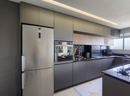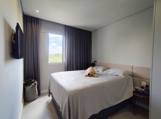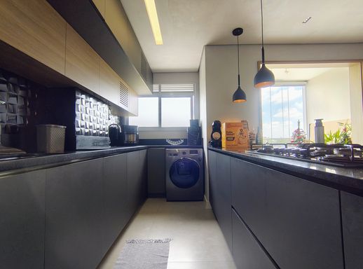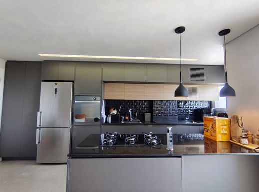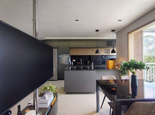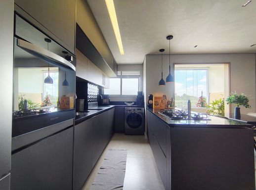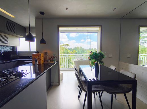 O imóvel é composto por uma sala de TV equipada com rack e painel rotativo para TV, uma sala de jantar . A cozinha, com armários planejados, é prática e moderna, equipada com cooktop, forno e coifa, e conta com lavanderia integrada, também com armário planejado, otimizando o espaço.