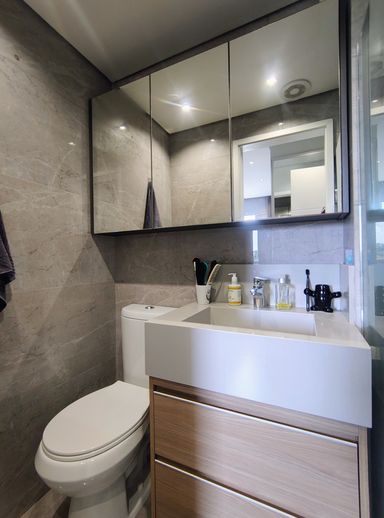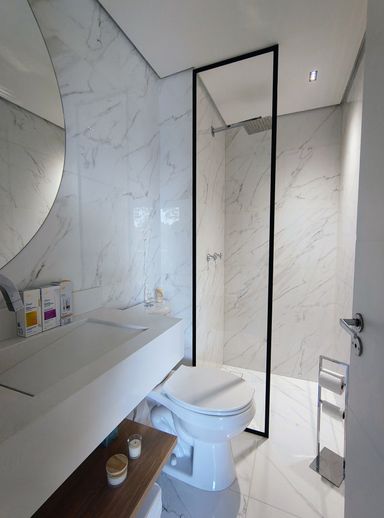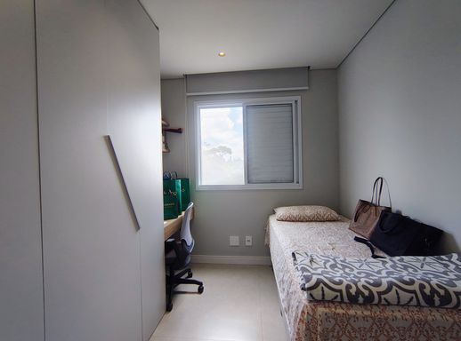 O apartamento possui dois dormitórios bem distribuídos. Ambos com guarda roupa planejado. O banheiro, que atende ambos os dormitórios, possui móveis planejados e um espelho grande na parede, complementando a funcionalidade do ambiente. O sistema de aquecimento a gás é um detalhe que adiciona conforto, garantindo água quente em todas as torneiras e chuveiros da casa.