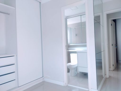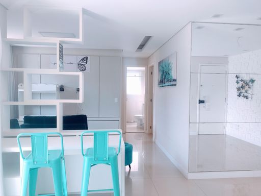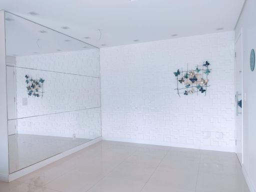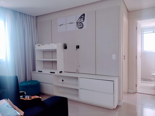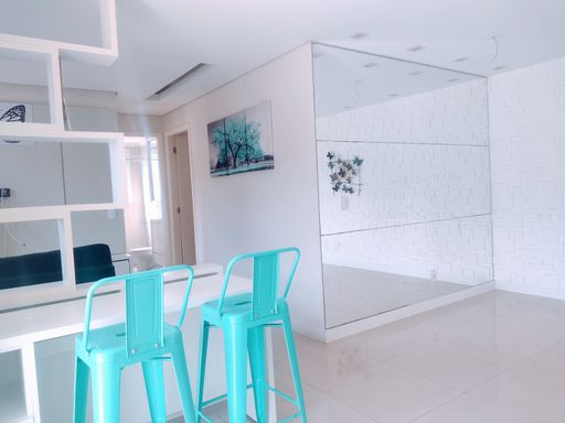 Ao entrar no apartamento, você se depara com um espelho que cobre toda a parede da sala de jantar, criando uma sensação de amplitude e luminosidade. Este detalhe arquitetônico não só expande visualmente o espaço, mas também acrescenta um toque moderno e sofisticado ao ambiente. A sala de TV, equipada com um rack e sofá, é um local ideal para momentos de relaxamento e entretenimento, proporcionando um ambiente arejado e claro.