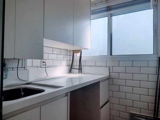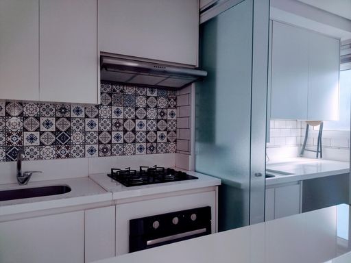 A cozinha é um dos pontos altos do imóvel, completa com muitos armários planejados que oferecem bastante espaço para armazenamento. Equipamentos de alta qualidade, como o cooktop, forno e coifa, tornam a cozinha um local funcional e prático para o dia a dia. A pia de granito branco ilumina o ambiente, dando uma sensação de limpeza e amplitude. A área de serviços, também equipada com bancada de granito branco e armários planejados, garante praticidade e organização nas tarefas domésticas.