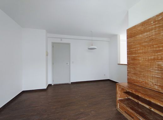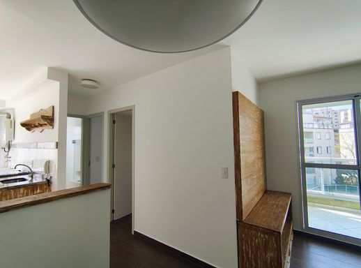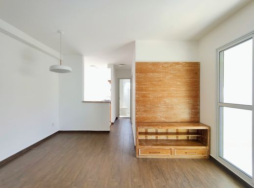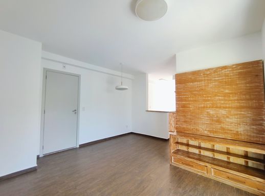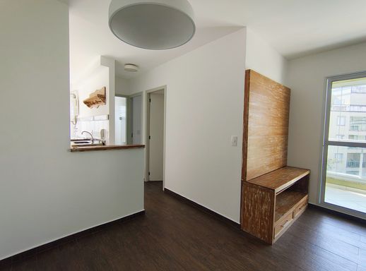 Logo ao entrar no apartamento, somos recebidos por uma agradável sala de estar e jantar integradas, formando um ambiente amplo e iluminado.