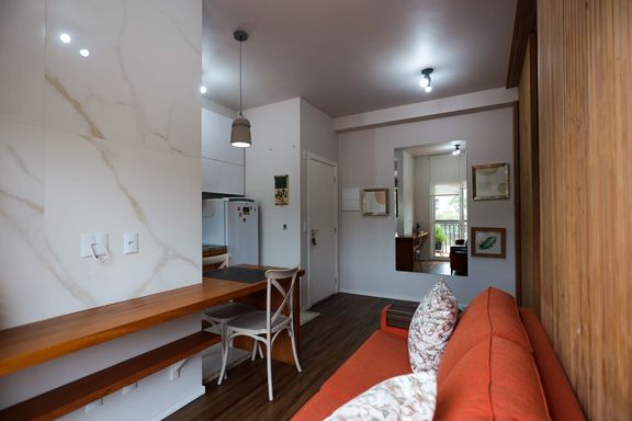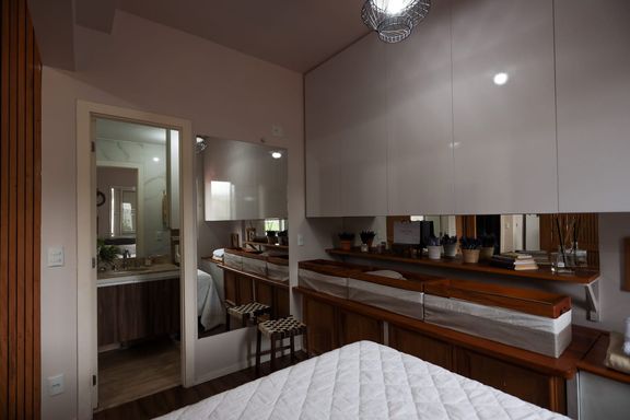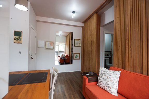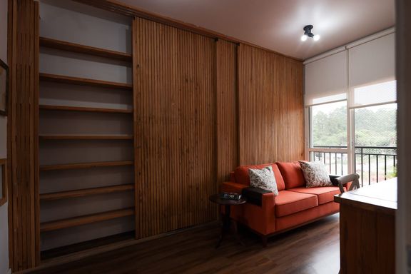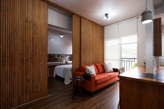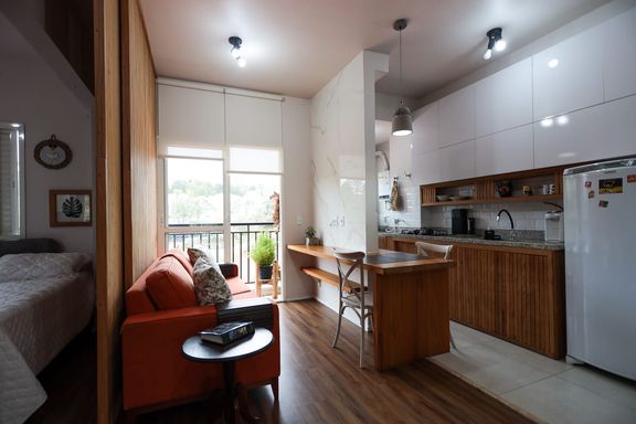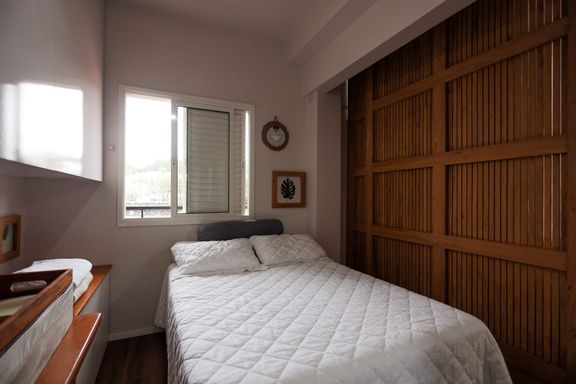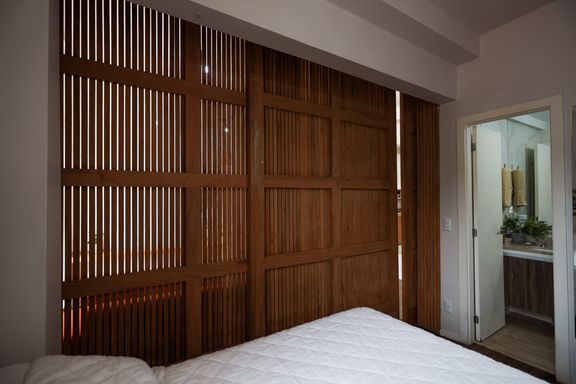 Desfrute de momentos relaxantes na linda vista da varanda, onde você pode apreciar a paisagem e recarregar as energias após um dia agitado. Além disso, o quarto separado com uma parede móvel ripada oferece versatilidade e privacidade, permitindo adaptar o espaço de acordo com suas necessidades.