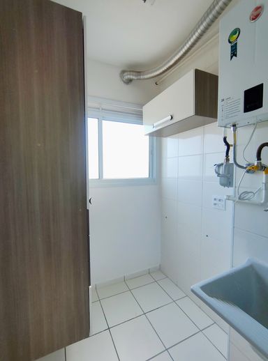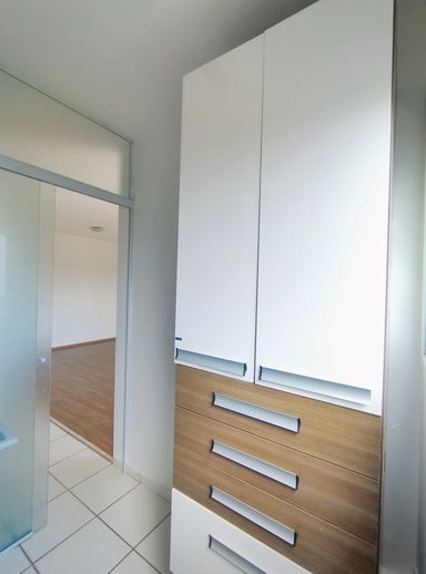 A cozinha, no estilo americano, está equipada com armários planejados de excelente qualidade, proporcionando organização e praticidade no dia a dia. Logo ao lado, a lavanderia também foi planejada, com armários funcionais e bem posicionados, otimizando cada metro quadrado da área de serviço.
