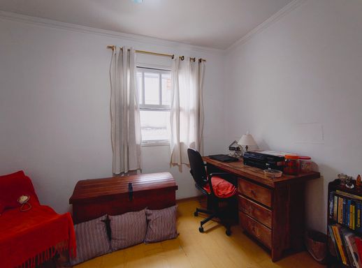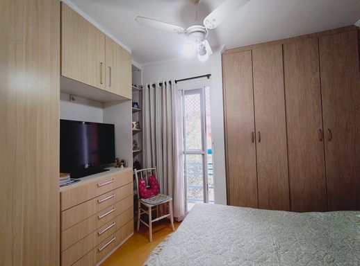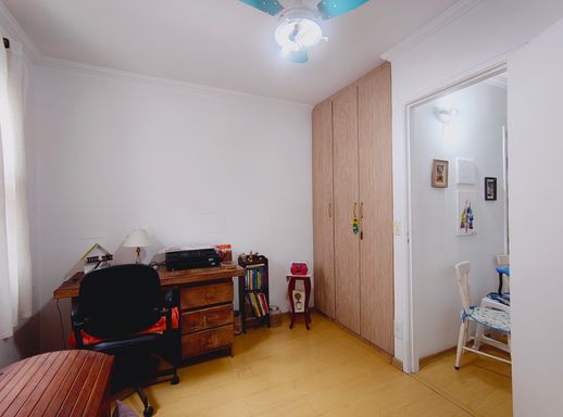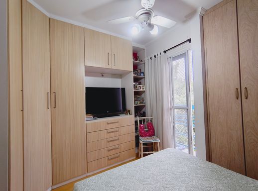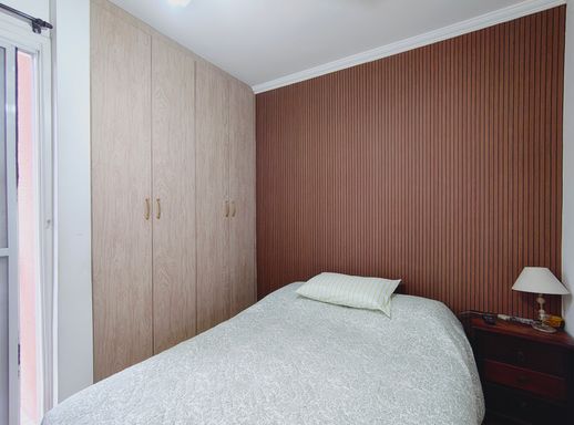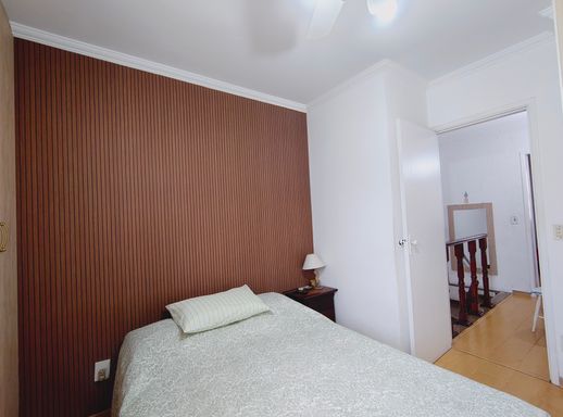No pavimento superior encontram-se dois dormitórios, sendo um deles equipado com amplo guarda-roupa planejado, além de um banheiro que atende aos quartos, garantindo conforto e praticidade para a rotina da família.