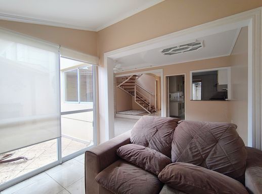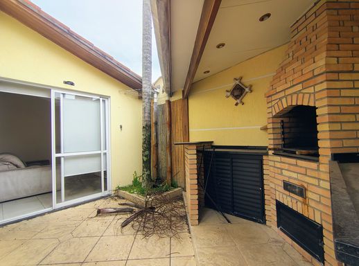 A garagem é coberta para dois veículos, com possibilidade de estacionar um terceiro carro em frente ao imóvel.