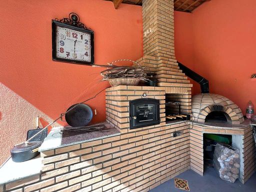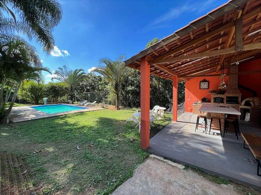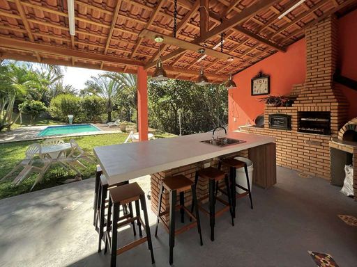 A área externa é um verdadeiro refúgio. O anexo gourmet é totalmente integrado à piscina e ao jardim, equipado com churrasqueira, forno e fogão à lenha, forno de pizza, ilha com pia em inox e amplo balcão, além de vestiário. A piscina de alvenaria mede 8 x 4 metros, é revestida em epóxi, possui escada interna, cascata, solarium e está preparada para aquecimento. O jardim conta ainda com diversas árvores frutíferas, como pitanga, acerola, lichia, macadâmia, laranja, banana, cereja e jabuticaba.