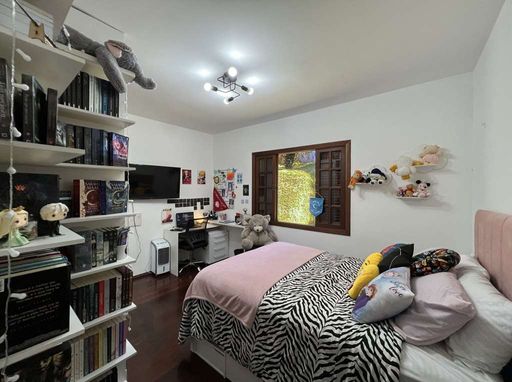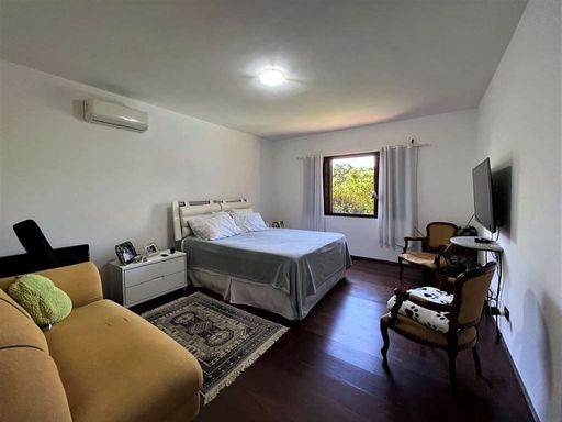 Na área íntima, com piso em tábuas largas de ipê, a casa dispõe de quatro dormitórios com armários e telas nas janelas, sendo duas suítes voltadas para o quintal, jardim e piscina. A suíte master conta com closet, ar-condicionado, banheiro com hidro, bidê e excelente acabamento. Os banheiros seguem o mesmo padrão, com cerâmica até o teto, espelhos, bancadas em granito, gabinetes e box de vidro.