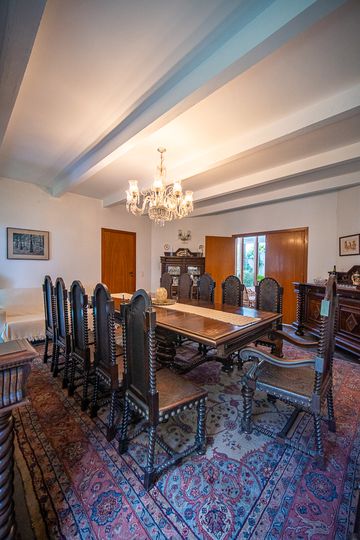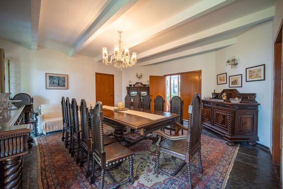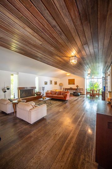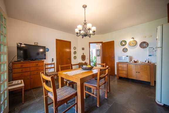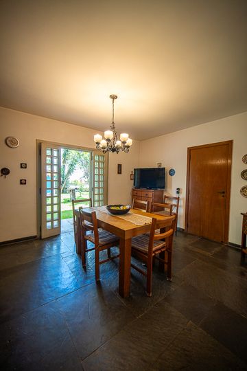 As salas sociais são amplas e conectadas por um elegante terraço em formato de “L”, totalmente voltado para a área externa, onde a piscina e o pomar compõem um cenário relaxante e privativo. A integração entre interior e exterior valoriza a iluminação natural e a ventilação cruzada, tornando os ambientes ainda mais agradáveis. O imóvel conta com espaços distintos para estar, jantar, TV e convivência, além de lareira, bar e home theater, ideais tanto para momentos em família quanto para receber convidados.
