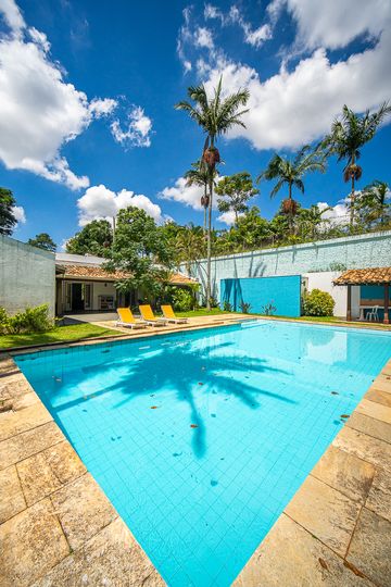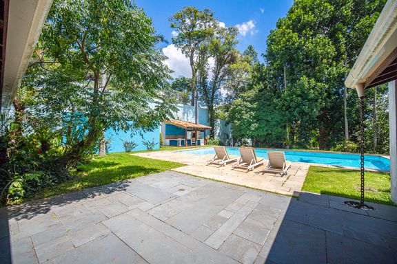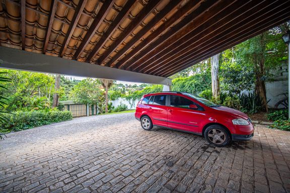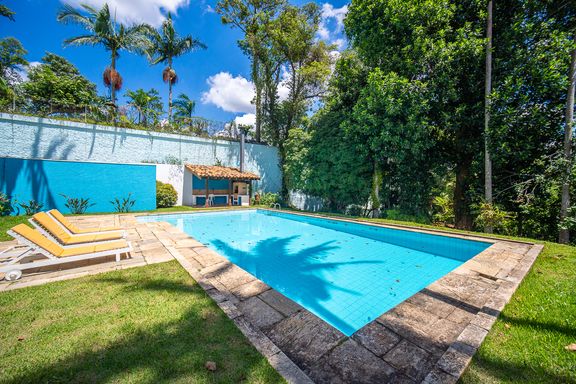 Na área externa, o amplo quintal gramado envolve a piscina e cria um ambiente perfeito para lazer ao ar livre, contemplação e convivência. O paisagismo maduro reforça a sensação de refúgio particular em meio à natureza, característica marcante da Granja Viana clássica. A propriedade conta com 9 vagas de garagem, além de infraestrutura completa, incluindo ar-condicionado, armários embutidos, água quente e vista panorâmica permanente.