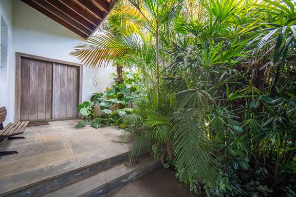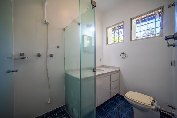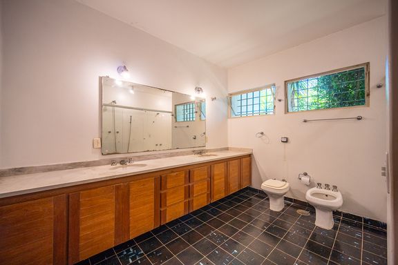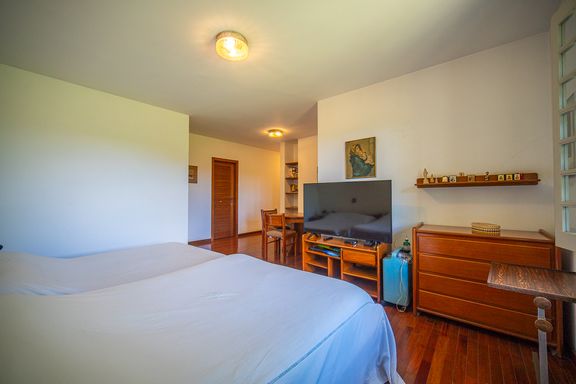 A área íntima oferece 5 dormitórios, todos configurados como suítes confortáveis, totalizando 5 suítes com ligação visual para o exuberante jardim, garantindo tranquilidade e frescor naturais. A suíte master se destaca pelo espaço generoso, hidromassagem e excelente iluminação. Ao todo, a residência possui 8 banheiros, atendendo com funcionalidade e elegância tanto às áreas sociais quanto aos dormitórios.