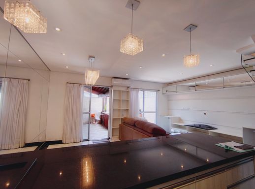 A casa é rica em armários, possui lustres elegantes e uma atmosfera clara e agradável em todos os ambientes.