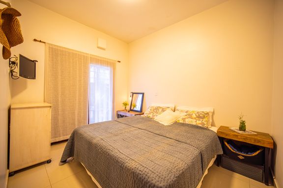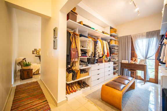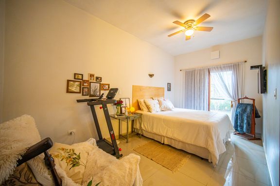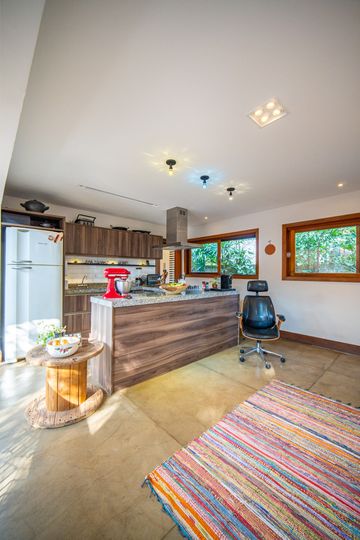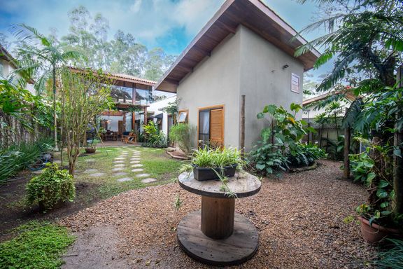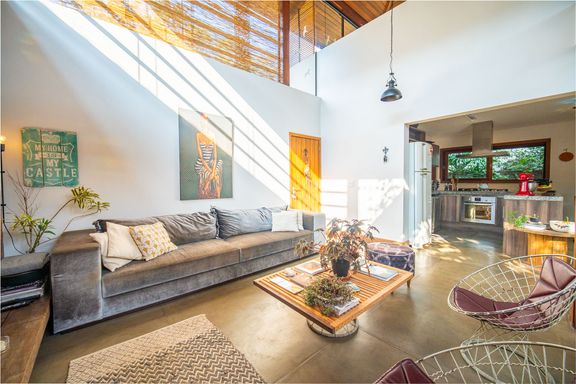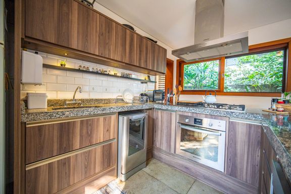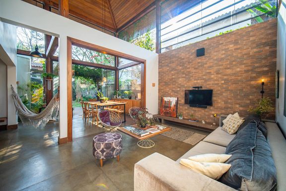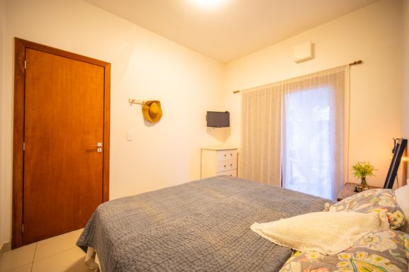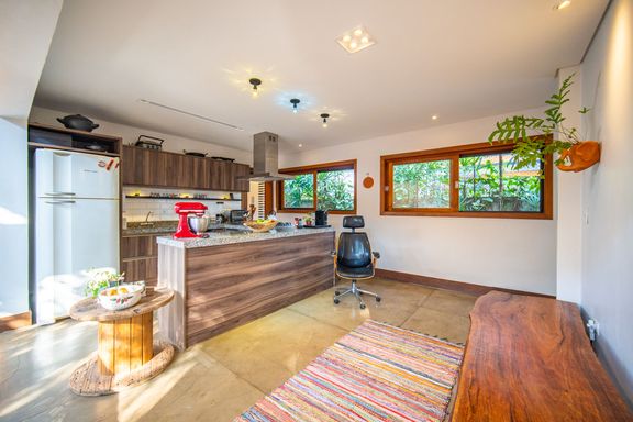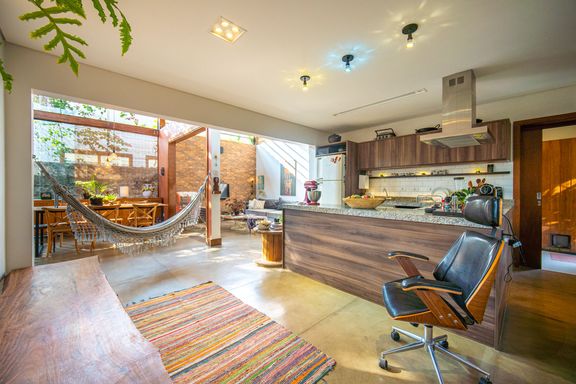 A residência possui dois dormitórios, sendo uma suíte com amplo closet, com possibilidade de adaptação para três quartos conforme a necessidade da família. Todos os dormitórios possuem acesso direto ao jardim, proporcionando ótima iluminação natural, ventilação e um agradável contato com o verde. A área social conta com uma sala espaçosa integrada em três ambientes, ideal para estar, jantar e convivência, com excelente luminosidade e integração com a cozinha americana planejada, criando um espaço prático e acolhedor para o dia a dia.