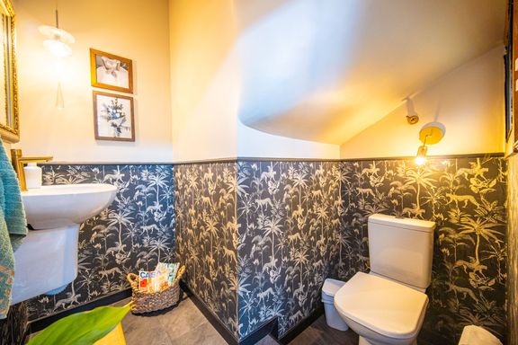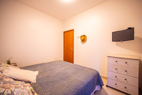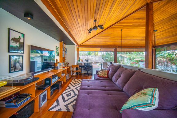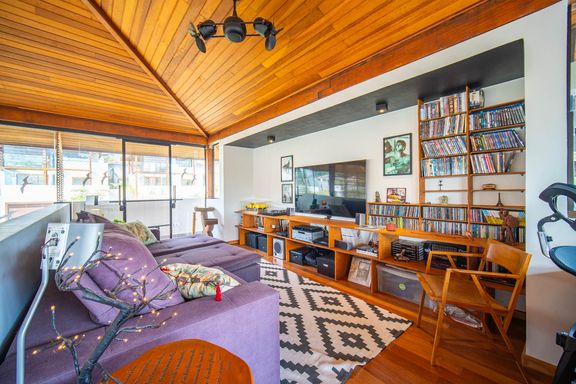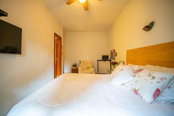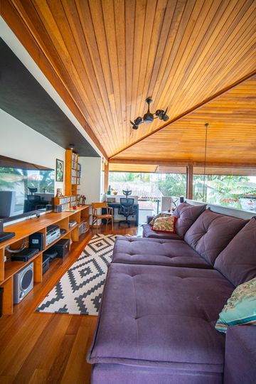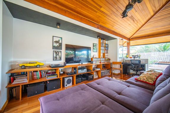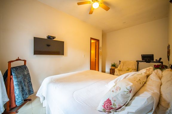 No piso superior, encontra-se uma confortável sala de TV com detalhes em vidro que valorizam a entrada de luz natural e proporcionam uma bela vista do pôr do sol. A casa também dispõe de lavabo e uma área de serviço ampla, funcional e bem distribuída, com banheiro completo que atende perfeitamente às necessidades da rotina doméstica.