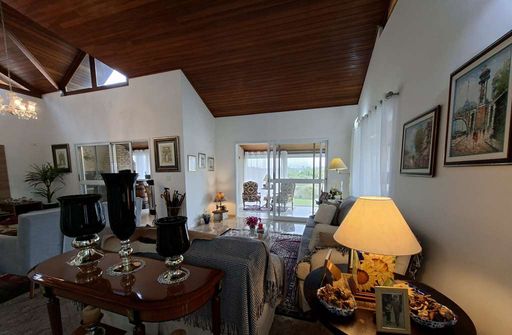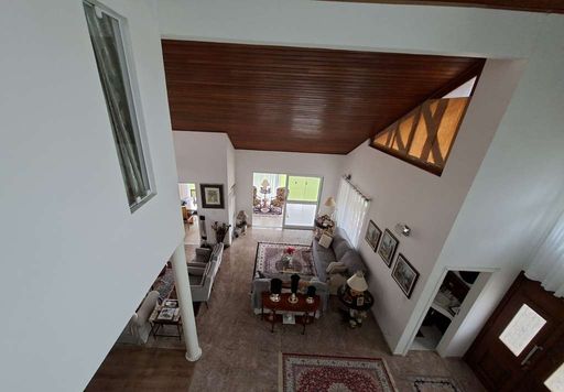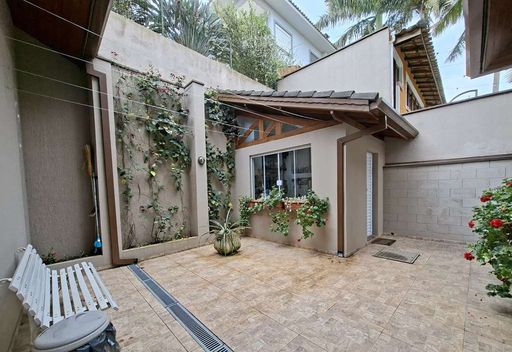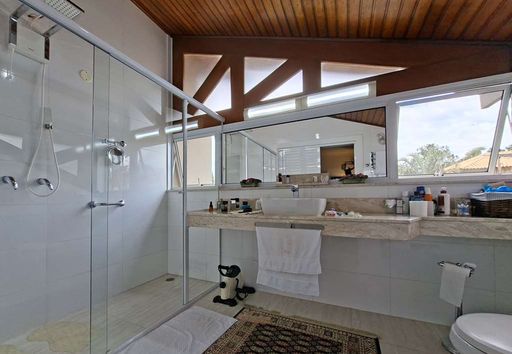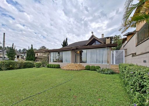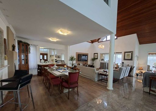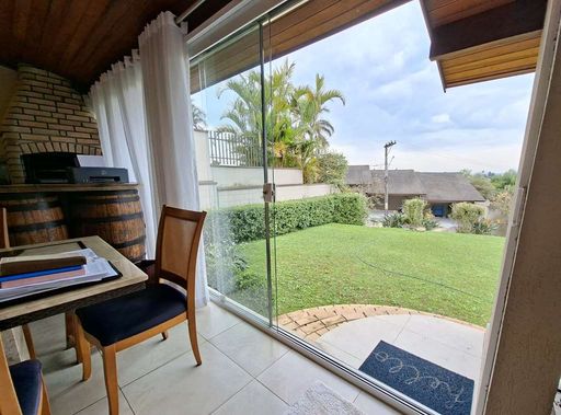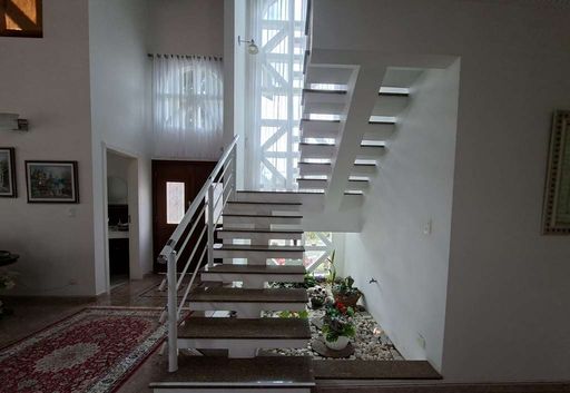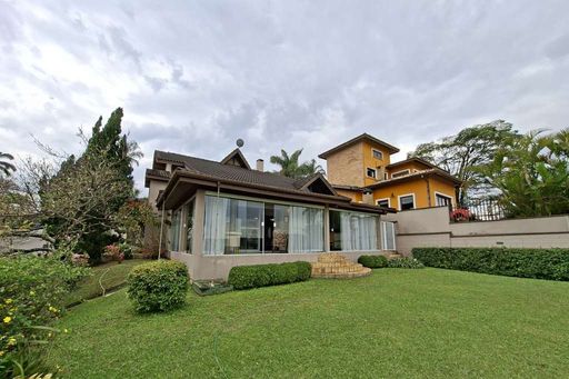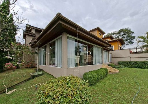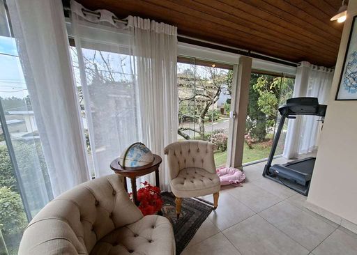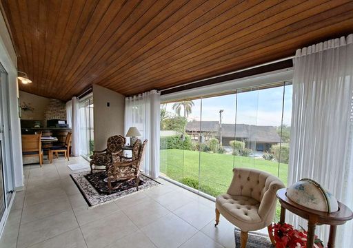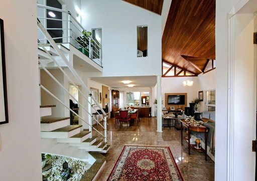 A residência possui hall de entrada com porta dupla imponente, lavabo e salas integradas de estar, TV e jantar com lareira, além de pé-direito alto que valoriza os ambientes. Conta ainda com jardim de inverno sob a escada e uma agradável varanda envidraçada com vista para o jardim, integrada ao espaço gourmet com churrasqueira, bancada e balcão.