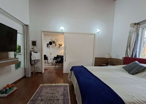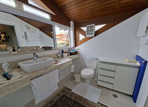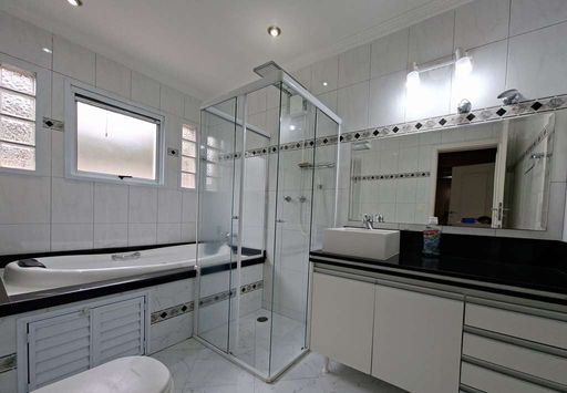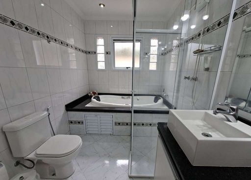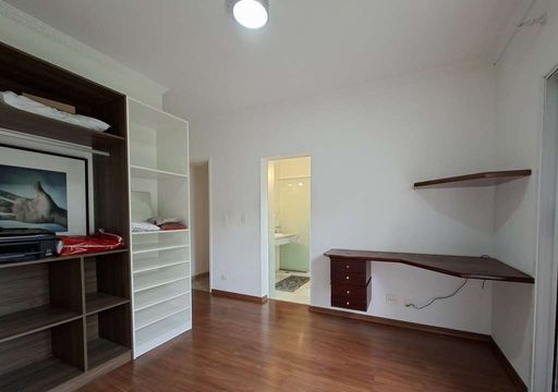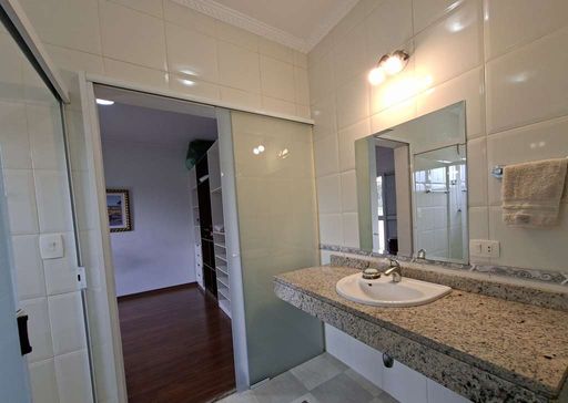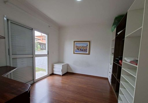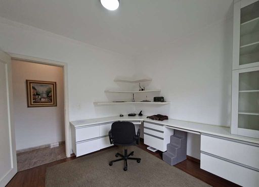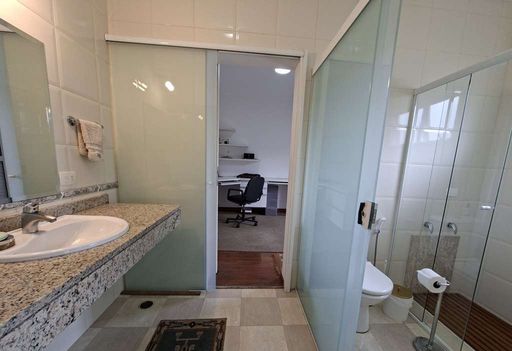 Na área íntima, duas suítes americanas, sendo uma adaptada como escritório, ambas com portas-balcão voltadas para o jardim frontal. No pavimento superior, destaca-se a suíte master ampla, com dois closets (senhor e senhora), sala íntima, banheiros independentes (um com hidromassagem), janelas antirruído e ar-condicionado.