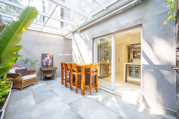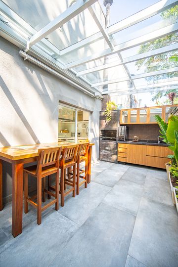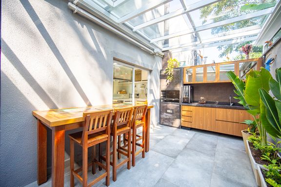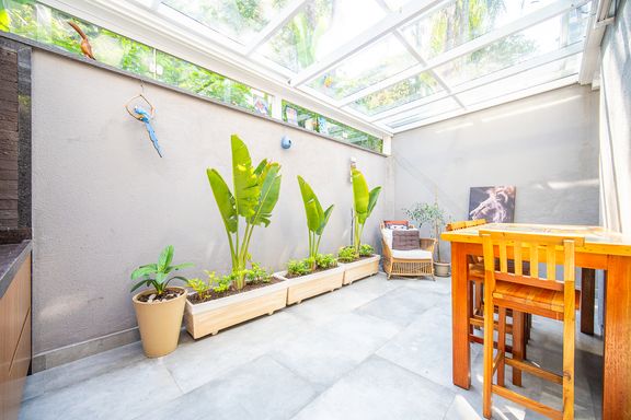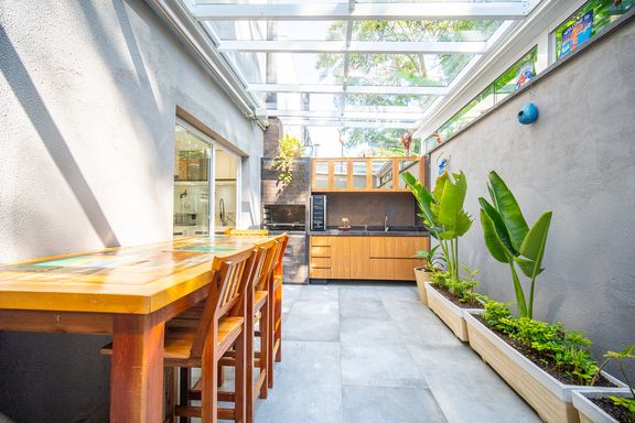 A casa conta ainda com corredor lateral coberto, teto retrátil que proporciona iluminação natural com controle sobre as condições climáticas, e duas vagas de garagem.