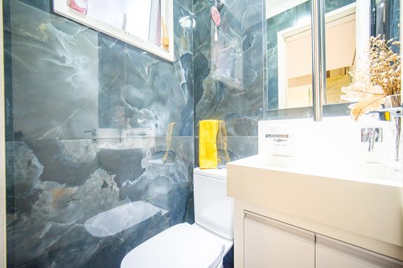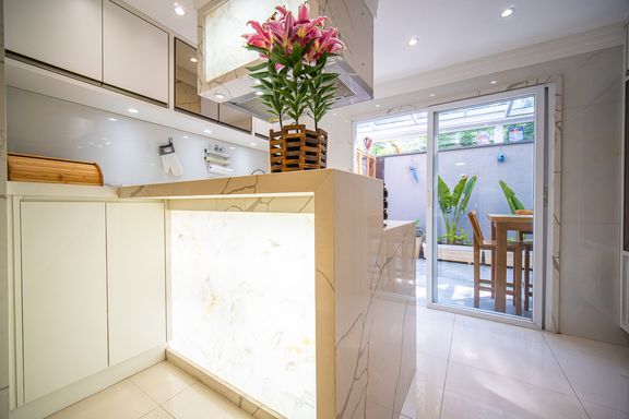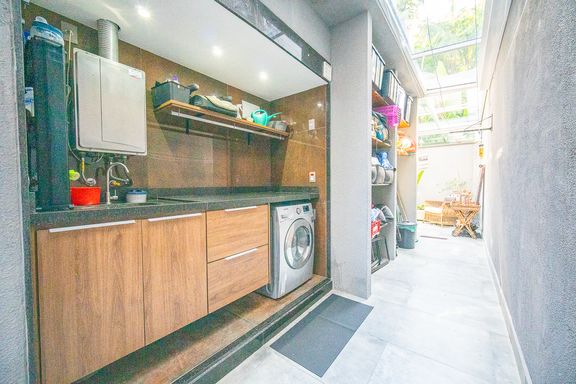 No piso inferior, o projeto integra uma cozinha planejada de maneira funcional e elegante, equipada com armários sob medida, além de um lavabo de apoio, ideal para receber visitas. A área externa é um charme à parte: um jardim vertical com lago ornamental oferece um respiro de natureza e sofisticação ao ambiente, transformando o quintal em um verdadeiro refúgio.