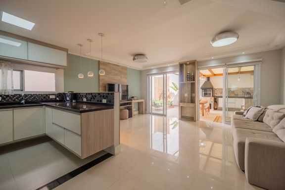 Ao entrar, você é recebido por uma ampla e bem iluminada sala, que integra dois ambientes, perfeitos para momentos de estar e jantar em família ou com amigos. A cozinha americana é moderna e conta com armários de alta qualidade, fogão embutido e coifa, oferecendo um espaço funcional para preparar suas refeições. A lavanderia, que possui acesso direto ao corredor lateral, garante ainda mais comodidade.