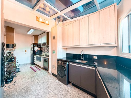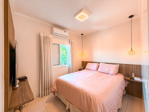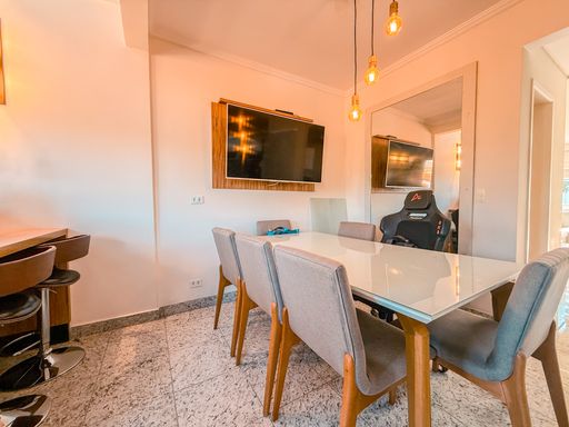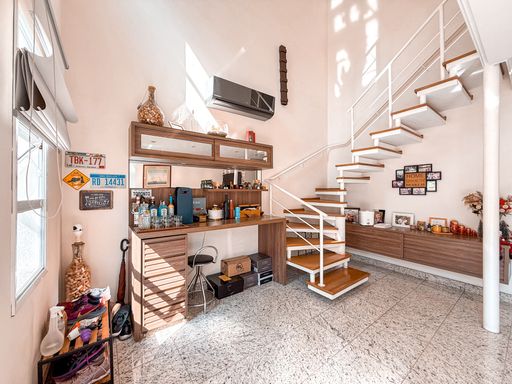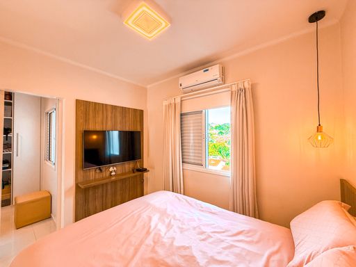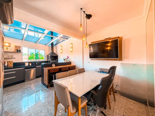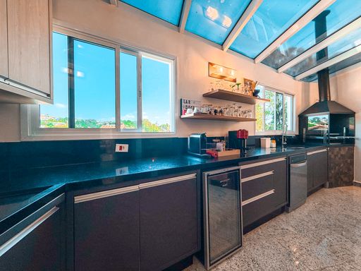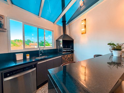 A residência apresenta um projeto contemporâneo, com sala de estar marcada pelo pé-direito duplo e pelos móveis fixos que permanecem no imóvel, criando um ambiente sofisticado e acolhedor. A sala de jantar integra-se à cozinha e à área gourmet, proporcionando fluidez e modernidade ao dia a dia. A cozinha, totalmente planejada, é equipada com fogão, forno, lava-louças e geladeira, com possibilidade de aquisição de outros eletrodomésticos, oferecendo praticidade e funcionalidade. Todos os ambientes contam com ar-condicionado, garantindo conforto térmico durante todo o ano.