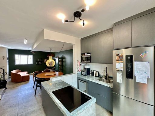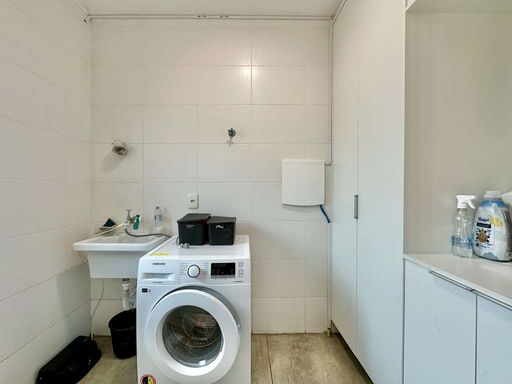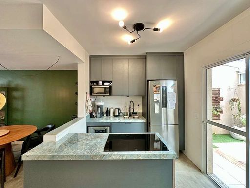 A cozinha é integrada à área social e conta com armários planejados, tampo em granito, fogão cooktop e forno embutido, proporcionando um espaço moderno e eficiente para o preparo das refeições. Ao lado, a área de serviço também possui armários planejados e porta de alumínio ventilada, com acesso direto ao quintal dos fundos, garantindo boa iluminação e ventilação natural.