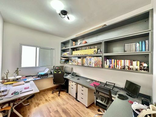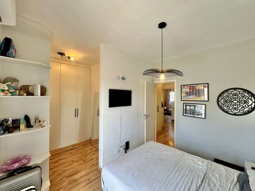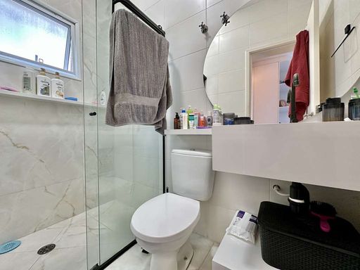 Na área privativa, o imóvel oferece três dormitórios, todos equipados com armários planejados, garantindo conforto e funcionalidade. A suíte principal conta com ar-condicionado e sacada privativa, criando um ambiente acolhedor e reservado. Os banheiros são completos, com box de vidro e acabamentos de bom gosto.