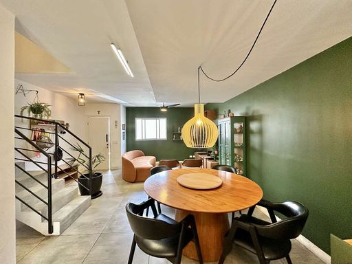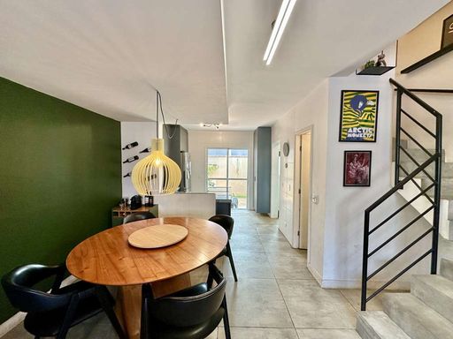 Este imóvel apresenta um projeto funcional e bem distribuído, ideal para quem busca conforto, praticidade e boa integração dos ambientes. Logo na entrada, o living acomoda dois ambientes harmoniosos, com sala de estar e sala de jantar integradas, valorizadas pelo piso em porcelanato, que garante elegância e fácil manutenção. O lavabo, estrategicamente posicionado sob a escada de acesso ao pavimento superior, oferece comodidade para o dia a dia e para receber visitas.