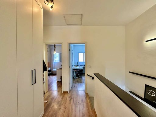 A escada de acesso ao pavimento superior é revestida em porcelanato e possui guarda-corpo e corrimão em ferro, combinando segurança e estilo. No andar íntimo, o hall dispõe de roupeiro, otimizando o espaço e facilitando a organização.