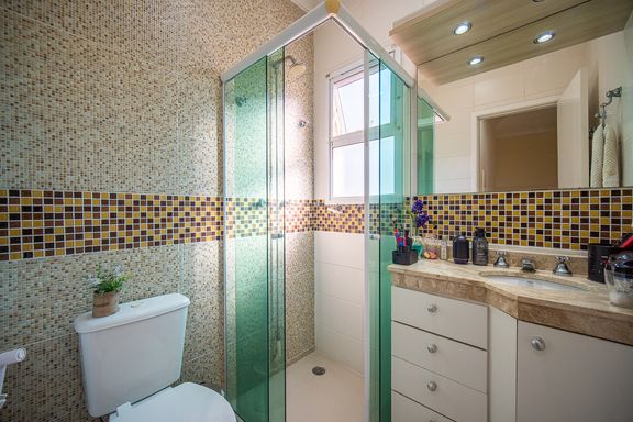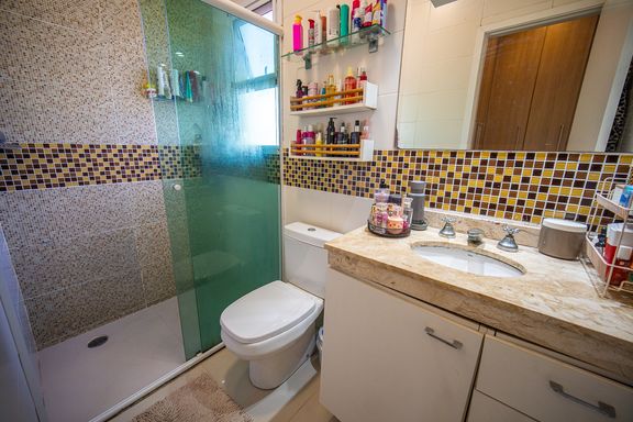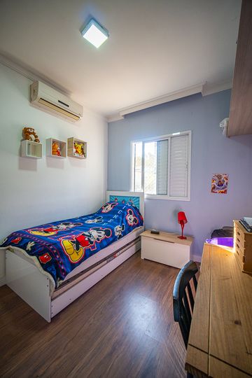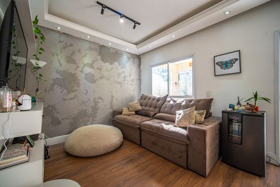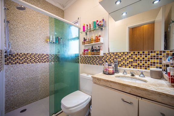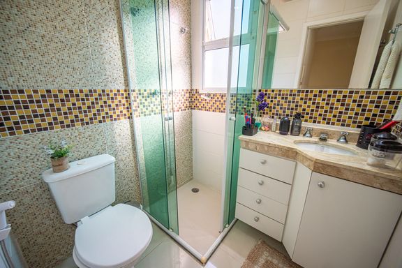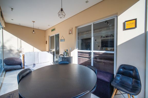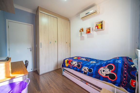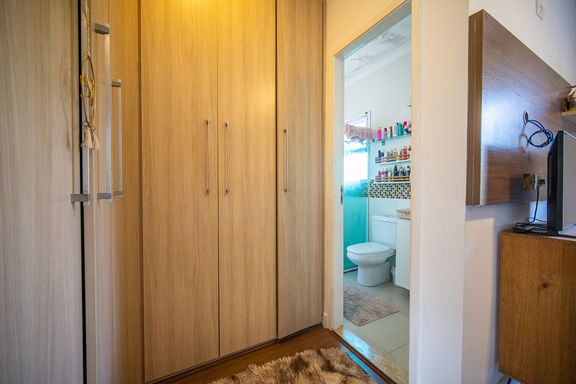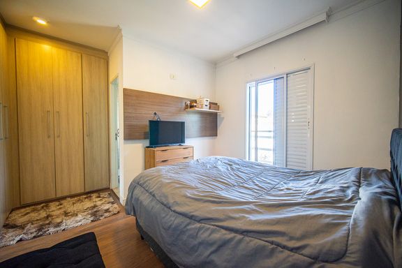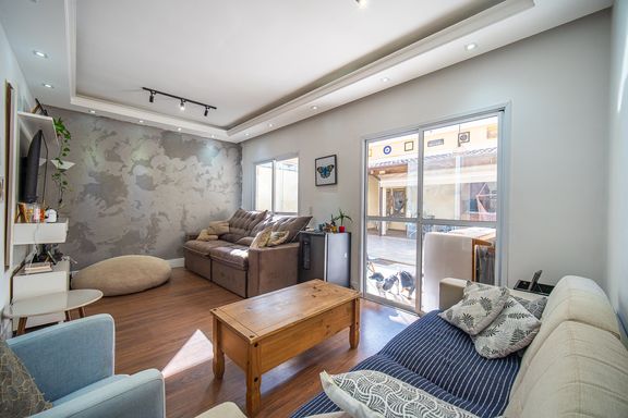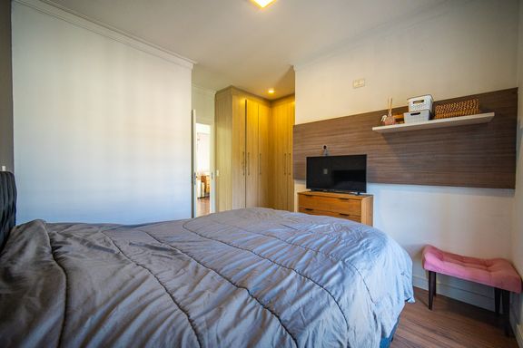 O imóvel conta com três dormitórios, sendo uma suíte confortável e bem iluminada. Os banheiros possuem acabamentos modernos e box instalados, garantindo funcionalidade e bom gosto. A sala é ampla, integrada e recebe excelente iluminação natural, criando um ambiente acolhedor e agradável para convivência.