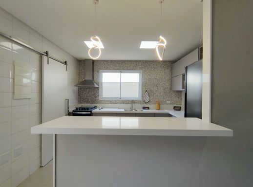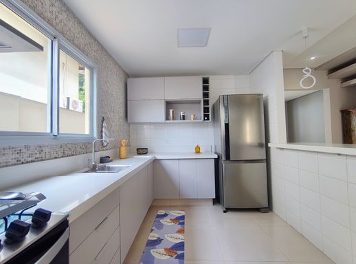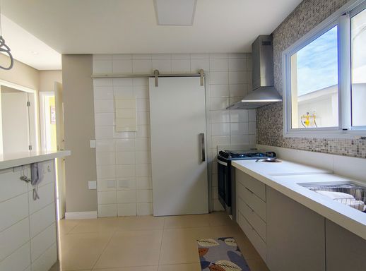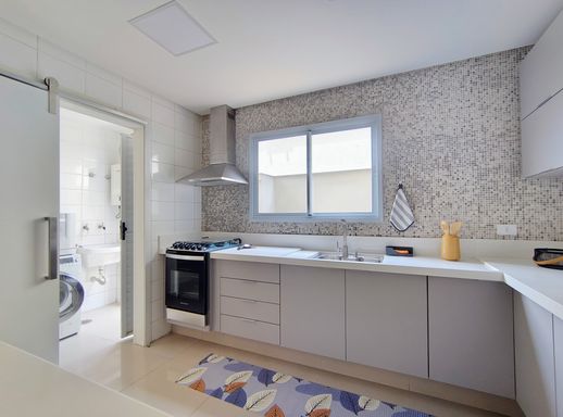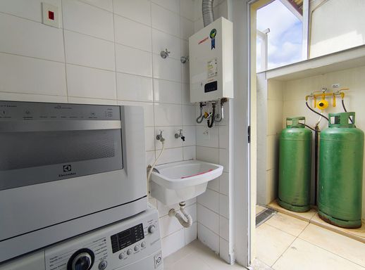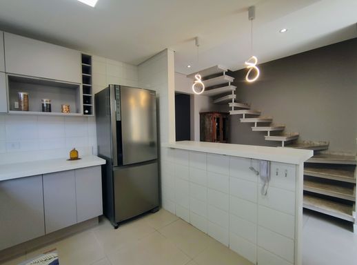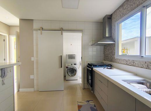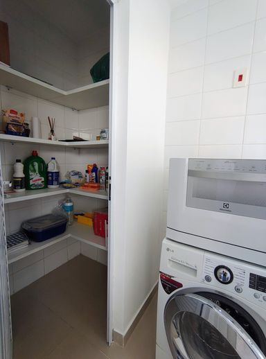 Ao entrar, você encontra uma cozinha prática e funcional, em conceito aberto, equipada com armários planejados novos, geladeira, forno, fogão e coifa. Ao lado, a lavanderia conta com máquina de lavar e despensa, garantindo organização e praticidade. Um lavabo que atende a este andar.