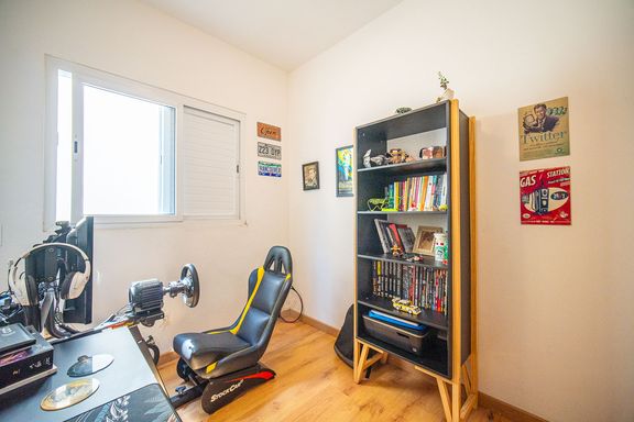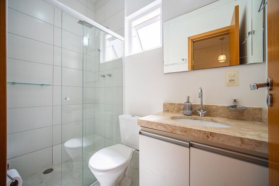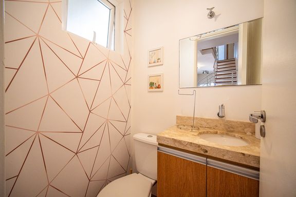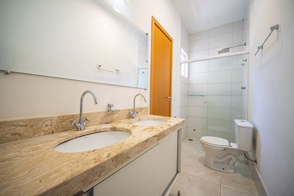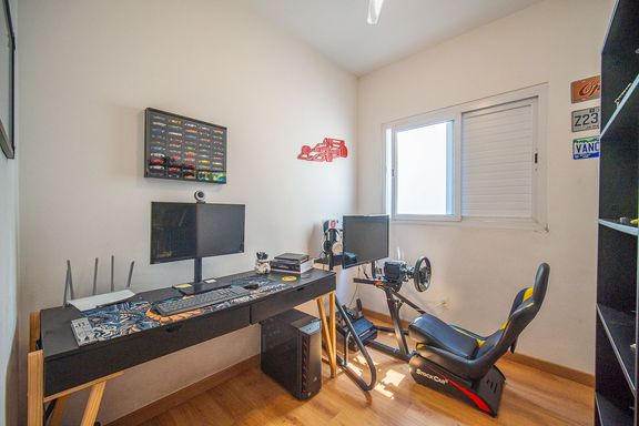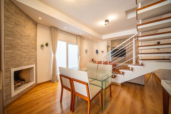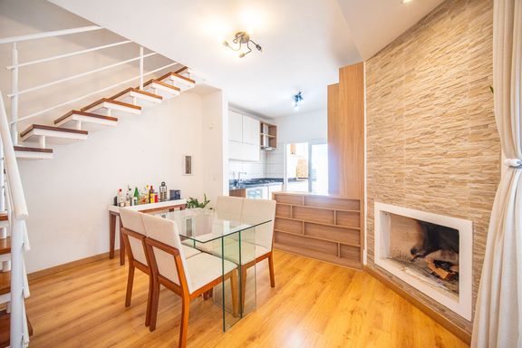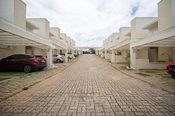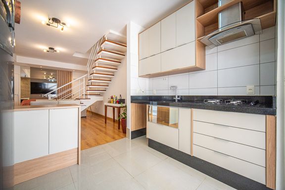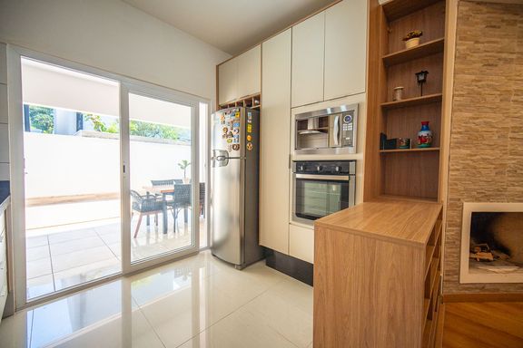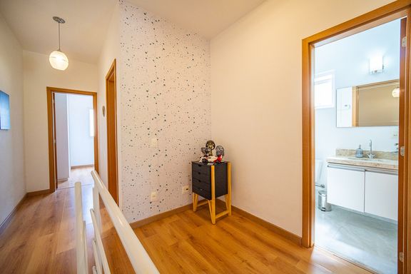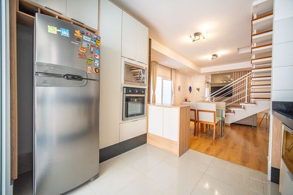 A residência conta com três dormitórios, sendo uma suíte com armários planejados e sacada, que garante privacidade e conforto. O lavabo no piso inferior complementa a praticidade do dia a dia, enquanto a cozinha planejada oferece funcionalidade e estilo, integrada à área gourmet com churrasqueira, perfeita para reunir amigos e familiares. O corredor lateral de serviço facilita o acesso e a ventilação do imóvel, e as duas vagas de garagem cobertas garantem comodidade e segurança.