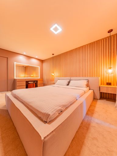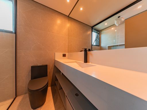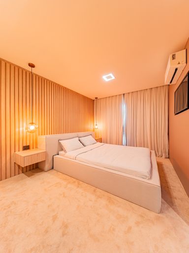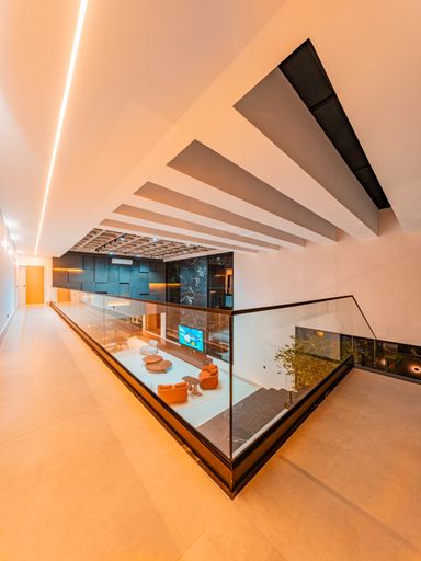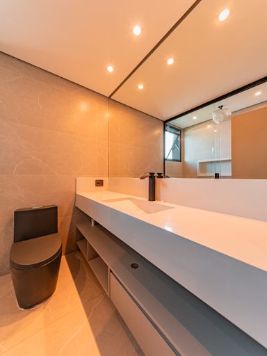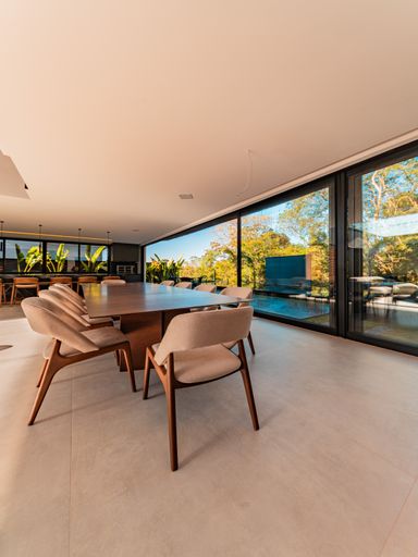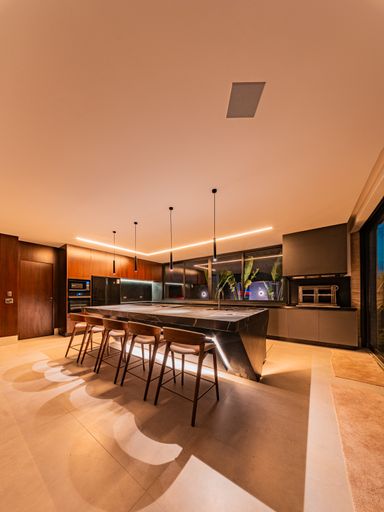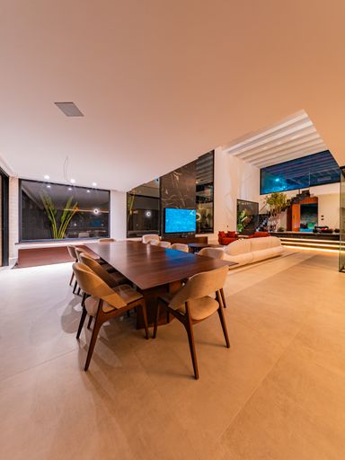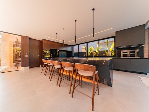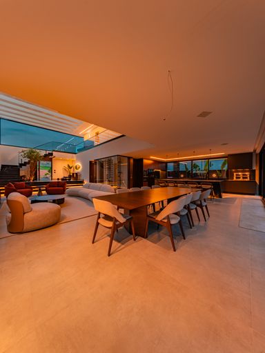 A área social é composta por uma ampla sala para três ambientes, com pé-direito duplo, totalmente planejada e mobiliada, proporcionando luminosidade natural, amplitude e uma atmosfera acolhedora. A integração com a cozinha e a área gourmet cria um espaço ideal para receber amigos e familiares, unindo design contemporâneo e praticidade. A casa conta ainda com lavabo elegante, totalmente executado em marcenaria e pedra inox, além de área de serviço funcional e bem posicionada.