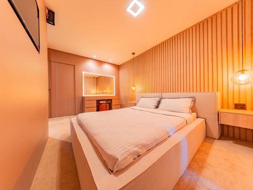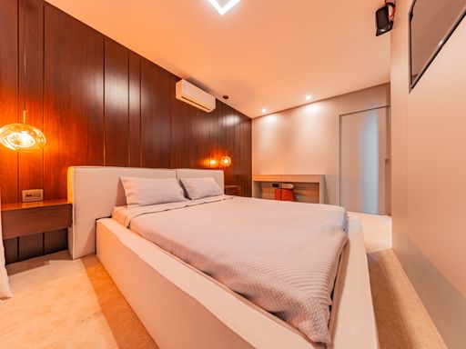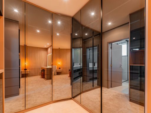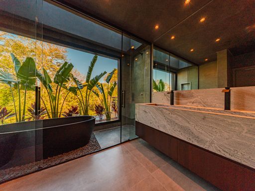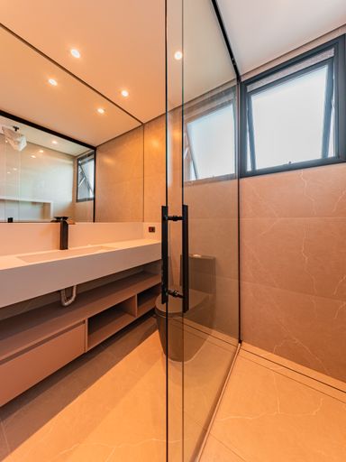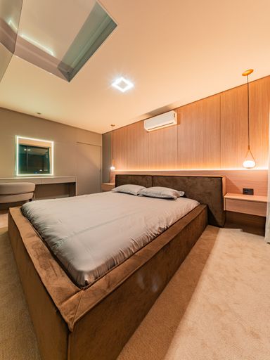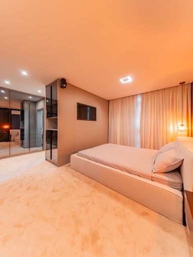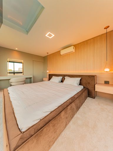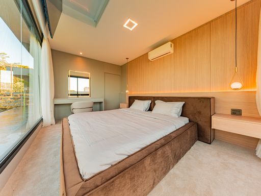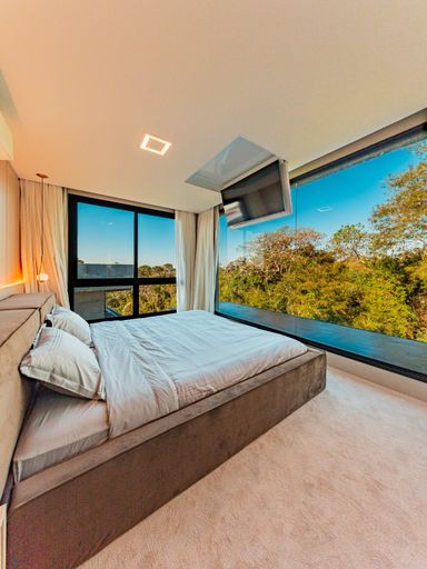 Na área íntima, o imóvel dispõe de três suítes amplas, todas repletas de armários planejados de alta qualidade. A suíte master é um verdadeiro refúgio, com closet e banheiro com vista privilegiada para a área de reserva, proporcionando momentos únicos de relaxamento e contato com a natureza. Um roupeiro estrategicamente posicionado complementa a funcionalidade do pavimento íntimo.