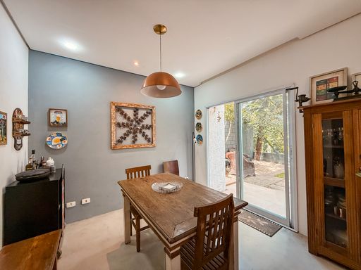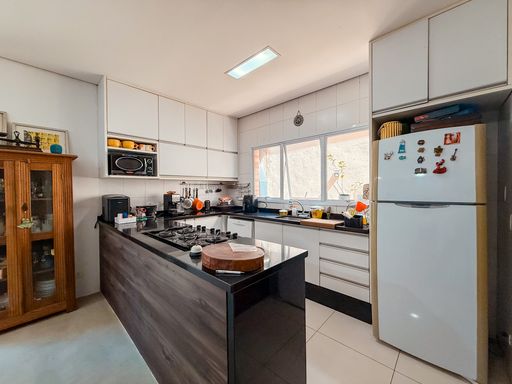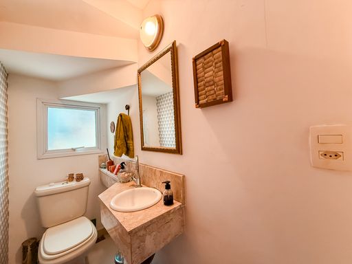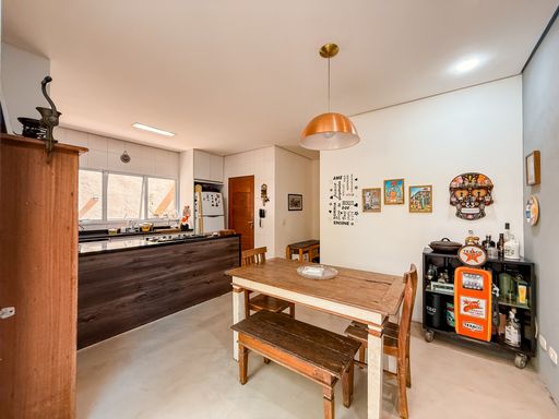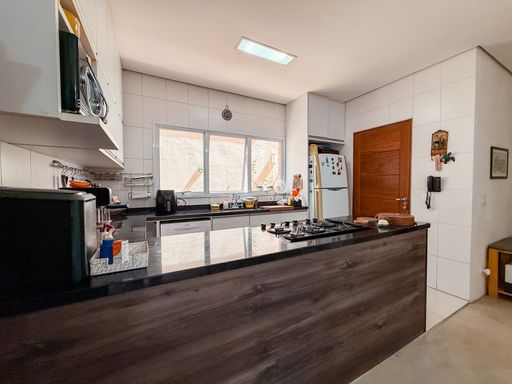 A cozinha planejada se integra perfeitamente à sala de jantar, oferecendo funcionalidade e praticidade. O imóvel dispõe ainda de lavabo, acesso lateral independente e área de serviço bem distribuída.