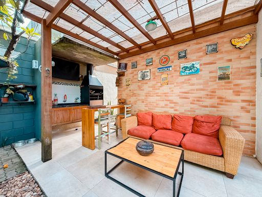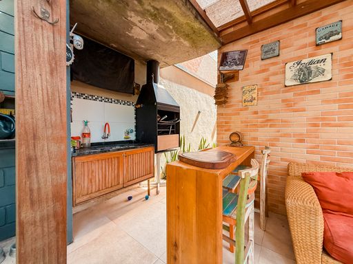 Na parte externa, a área gourmet com churrasqueira é perfeita para receber amigos e familiares, criando um espaço agradável para lazer e confraternizações.