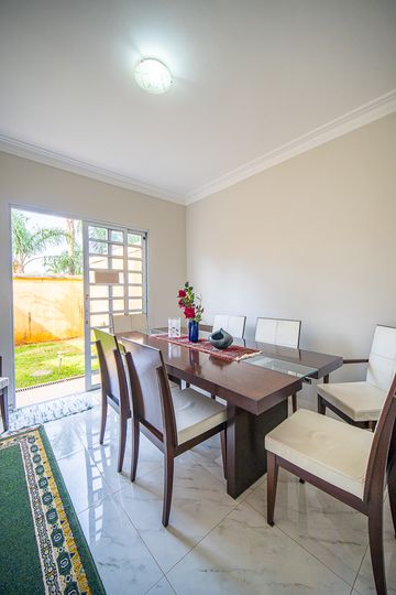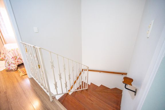 No piso superior, a área íntima dispõe de três dormitórios, sendo uma suíte, além de corredor com roupeiro. Os acabamentos foram cuidadosamente escolhidos, com porcelanato na área social e laminado nos quartos, combinando sofisticação e conforto. O imóvel ainda oferece duas vagas de garagem descobertas.