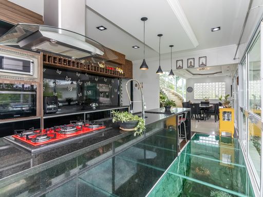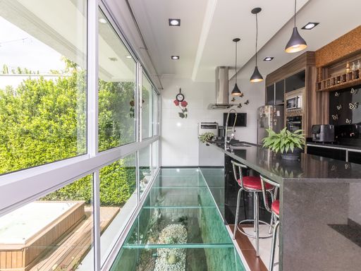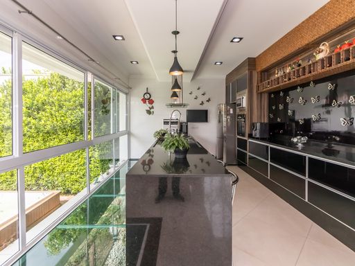 A cozinha ampla e funcional surpreende com um detalhe único: parte do piso em vidro, que revela um charmoso mini jardim, trazendo ainda mais luz natural e personalidade ao espaço. O imóvel conta também com dependência de serviço, garantindo praticidade no dia a dia.