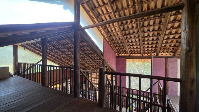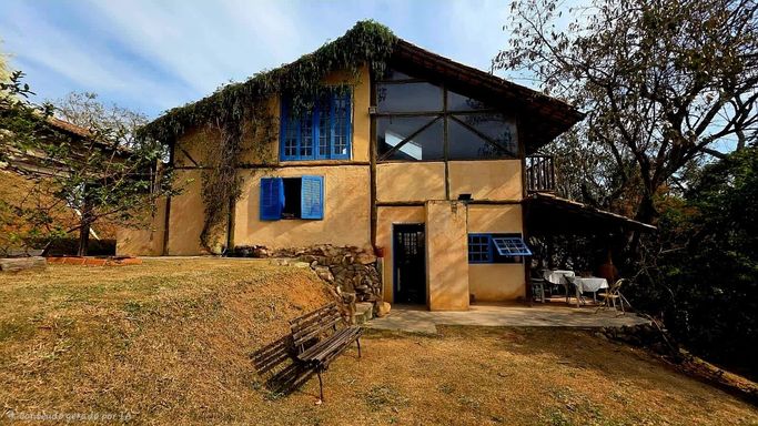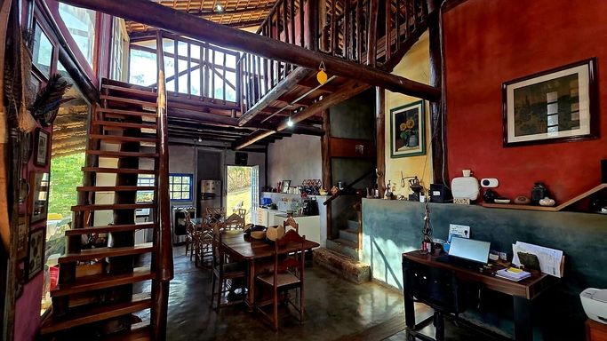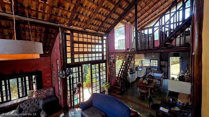 Casa rústica à venda em condomínio fechado, um verdadeiro refúgio cercado pelo verde, ideal para quem busca qualidade de vida, privacidade e conexão com a natureza sem abrir mão de conforto e segurança. Implantada em terreno amplo de 1.500 m², a propriedade se destaca pela arquitetura única e cheia de personalidade, construída em eucalipto autoclavado, com pé-direito duplo, telhado aparente e grandes panos de vidro que integram os ambientes internos à paisagem natural ao redor. O piso em cimento queimado reforça o estilo rústico contemporâneo, enquanto portas e janelas de madeira de demolição e o assoalho ripado da sala de lareira trazem aconchego e sofisticação na medida certa.