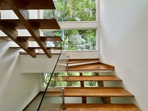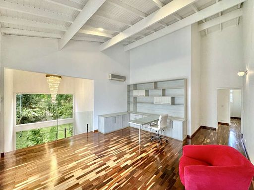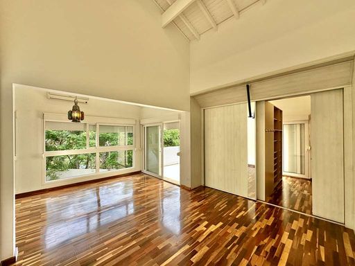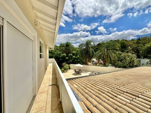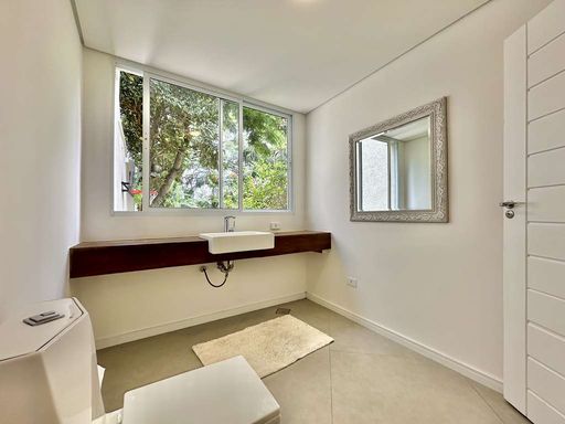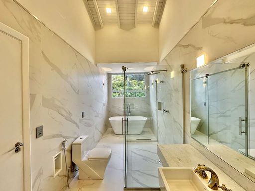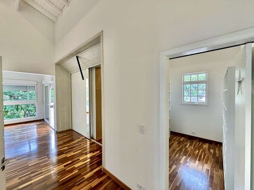 No pavimento superior, a área íntima oferece três suítes amplas, todas com closet, ar-condicionado quente e frio, varandas e terraços com vista para o verde. A suíte master se destaca pelo espaço generoso, saleta privativa, closet senhor e senhora e banheiro sofisticado com duas cubas e banheira. Há ainda um escritório envidraçado com varanda, perfeito para home office em meio à tranquilidade da natureza.