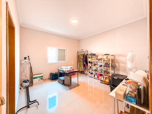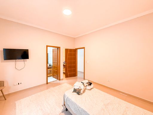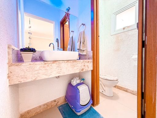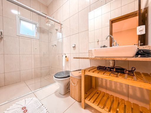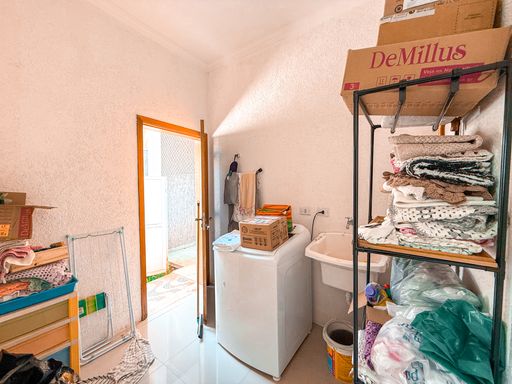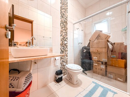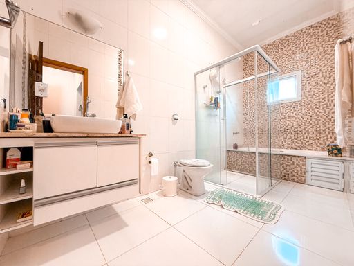 Na área íntima, o imóvel dispõe de três suítes espaçosas, todas com excelente potencial para closet, garantindo conforto e privacidade aos moradores. Além dos banheiros das suítes, a casa conta com lavabo, atendendo perfeitamente a área social. A área de serviço é funcional e bem posicionada, contribuindo para a rotina da casa de forma prática e discreta.