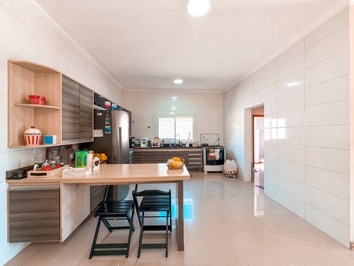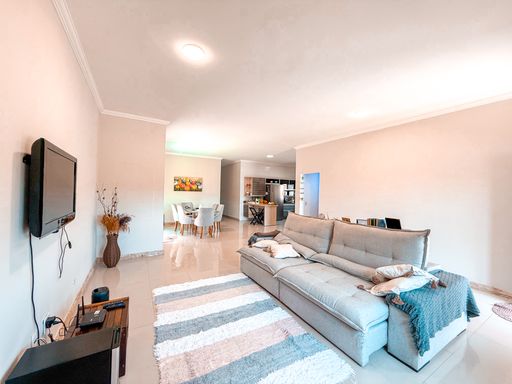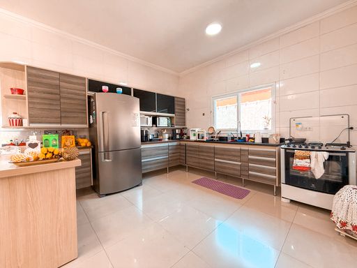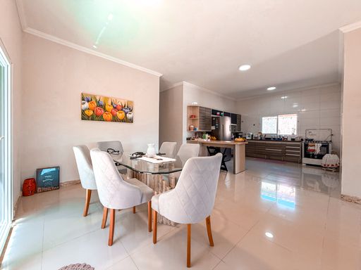 Implantada em um terreno amplo de 630 m², com 203 m² de área construída, a casa apresenta um projeto funcional e confortável, ideal para quem busca morar bem em um imóvel térreo, com ambientes bem distribuídos e ótima iluminação natural. A área social conta com sala para dois ambientes, proporcionando integração e conforto para o dia a dia e para receber convidados. A cozinha possui móveis planejados, oferecendo praticidade, organização e excelente aproveitamento de espaço.