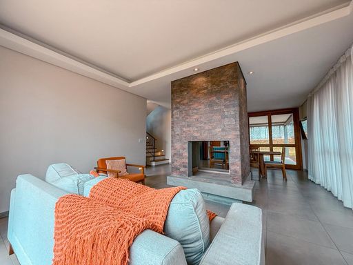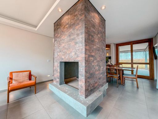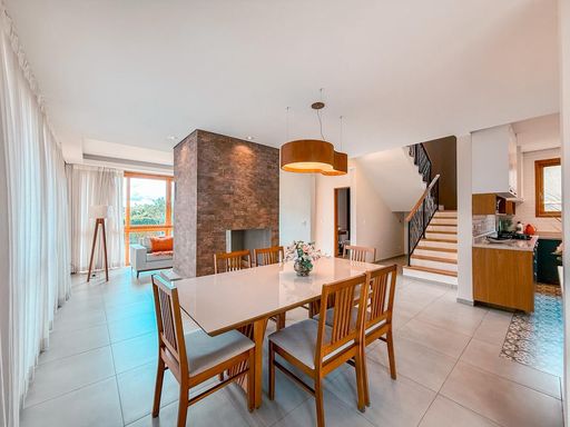 A área social é composta por uma elegante sala de estar com lareira central, proporcionando um ambiente acolhedor e charmoso, integrada à sala de jantar, perfeita para momentos de convivência e recepções. O piso térreo conta também com lavabo, que atende com praticidade moradores e visitantes.