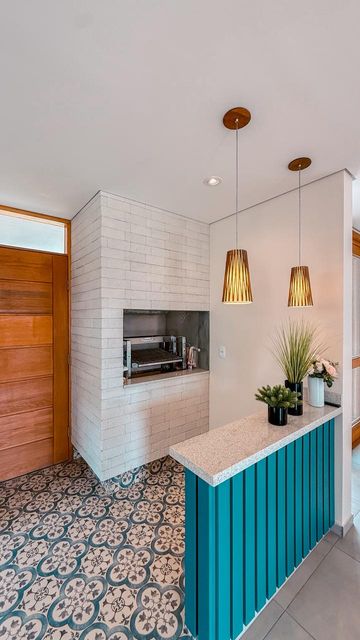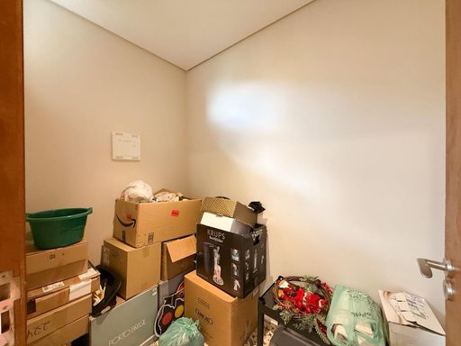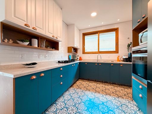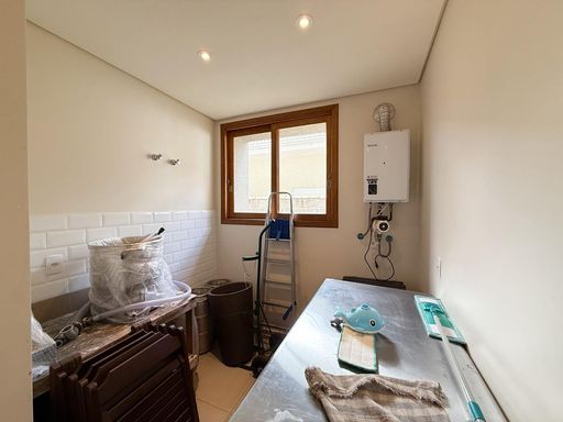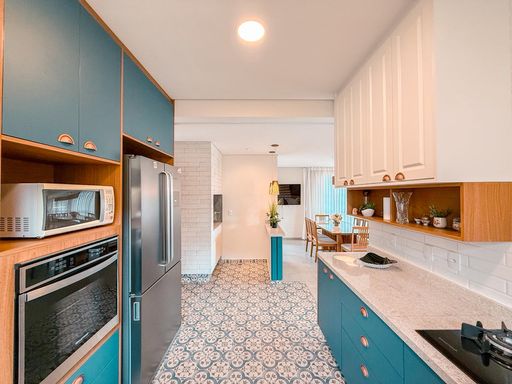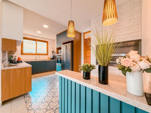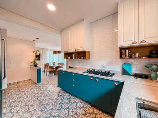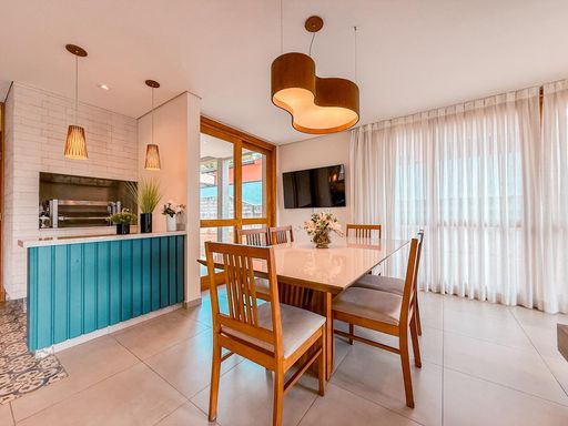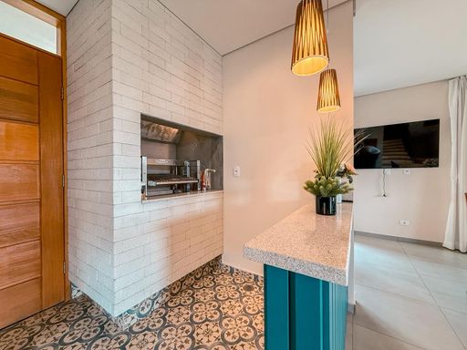 A cozinha possui móveis planejados e conta com churrasqueira interna, trazendo praticidade para quem aprecia receber amigos e familiares. Ao lado, uma despensa complementa o espaço, oferecendo mais organização para o dia a dia.