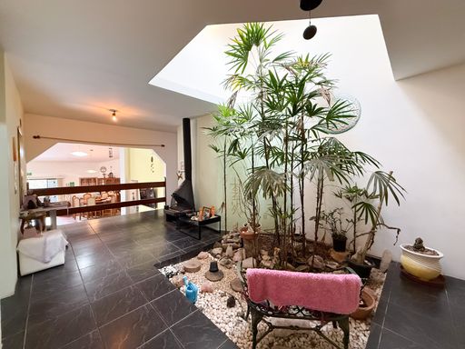 Na área externa, o lazer é completo, com piscina, churrasqueira e sala de jogos, criando o cenário perfeito para momentos de descontração com família e amigos. A ampla área verde do terreno reforça a sensação de espaço e liberdade, além de valorizar ainda mais a integração com a natureza.